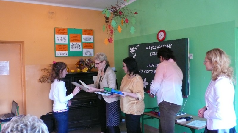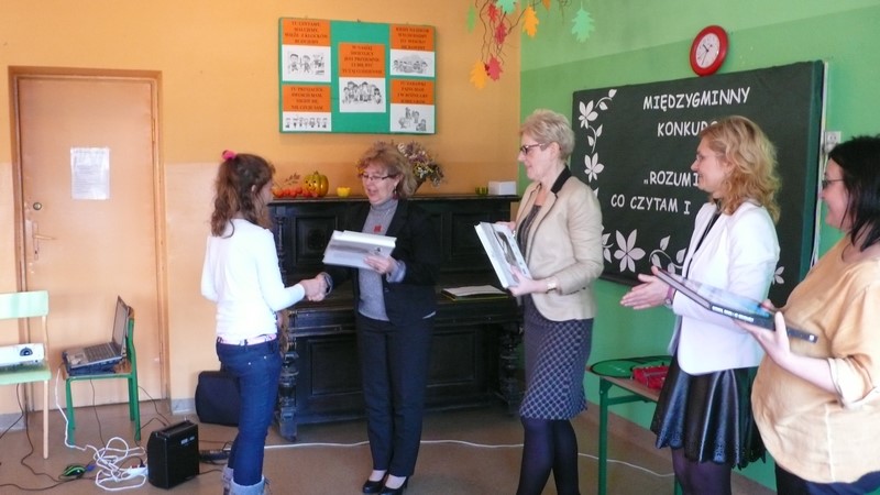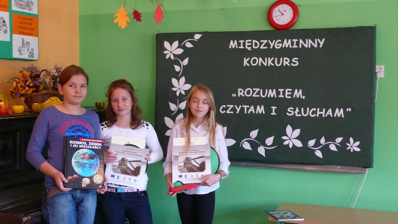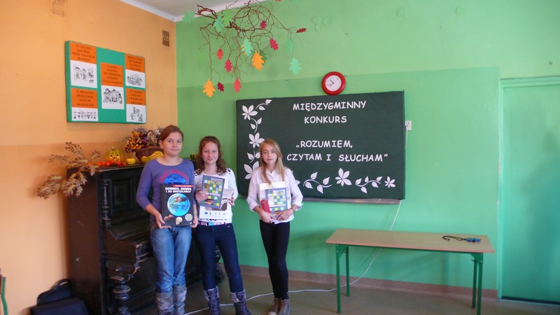 W piątek 31.10.2014 r. uczniowie naszej szkoły: Martyna Stencel, Julia Herok i Miłosz Knura wzięli udział w Międzygminnym Konkursie „Rozumiem, co czytam i słyszę” zorganizowanym przez panią Annę Maciaszek w Szkole Podstawowej w Pstrążnej we współpracy z Gminną Biblioteką Publiczną w Kornowacu, Biblioteką Publiczną w Pstrążnej oraz Szkołą Podstawową w Kobyli. Konkurs podzielony był na trzy etapy, na każdym z nich uczniowie zmierzyli się z zadaniami sprawdzającymi umiejętność czytania lub słuchania ze zrozumieniem. Stanowiło to duże wyzwanie dla uczestników; testy nie były łatwe, więc musieli być bardzo skoncentrowani. Nasi reprezentanci poradzili sobie jednak znakomicie. Dziewczynki osiągnęły najwyższe wyniki i znalazły się na podium. Julia Herok z kl. V zajęła I miejsce, a Martyna Stencel z klasy VI miejsce II. Cieszymy się z sukcesu i gratulujemy laureatkom!