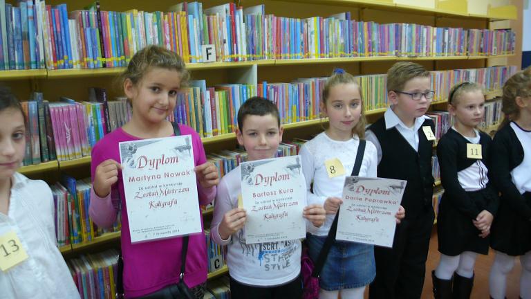W piątek, 8 listopada, uczniowie naszej szkoły wzięli udział w II Powiatowym Konkursie Pięknego Pisania „Zostań Mistrzem Kaligrafii”, który został zorganizowany w Miejskiej i Powiatowej Bibliotece Publicznej im. Ryszarda Kincla w Raciborzu. Celem konkursu było propagowanie wśród uczniów nieco zapomnianej już sztuki pisania piórem, zachęcenie do dbania o estetykę i charakter pisania oraz rozwijanie zasad poprawnego stylu pisania. W kategorii klas I-III naszą szkołę reprezentowali: Bartosz Kura z kl. II oraz kl. III Martyna Nowak i Daria Poprawka, natomiast w kategorii klas IV-VI uczennice kl. VI: Sandra Ber, Aurelia Starok oraz Martyna Stencel. Choć nie zdobyliśmy laurów, bardzo cieszy samo wzięcie udziału w takim wydarzeniu. Atmosfera była bardzo miła, a wszyscy uczestnicy zostali nagrodzeni pamiątkowymi dyplomami.
