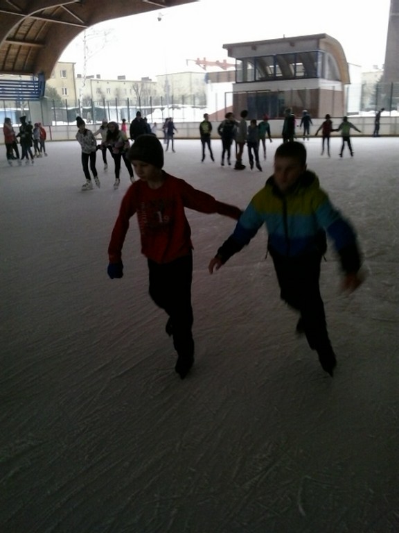 Wszyscy z ogromnym zapałem wjechali na taflę. Jedni doskonalili swe umiejętności, a inni dopiero zaczynali swą przygodę z łyżwami. Niestrudzenie podnosili się z kolejnych upadków, by znów jechać dalej. Dla nich za wytrwałość i upór ogromne brawa:) Wyjazd sprawił uczniom ogromną radość, bez zastrzeżeń dostosowali się do regulaminu; spokojnie i bezpiecznie korzystali z lodowiska, dzięki czemu zasłużyli na pochwałę i obietnicę kolejnego wyjazdu na lodowisko. Oczywiście, po niestrudzonym godzinnym treningu na lodowisku, wszyscy uzupełnili brakujące kalorie w pobliskiej pizzerii.