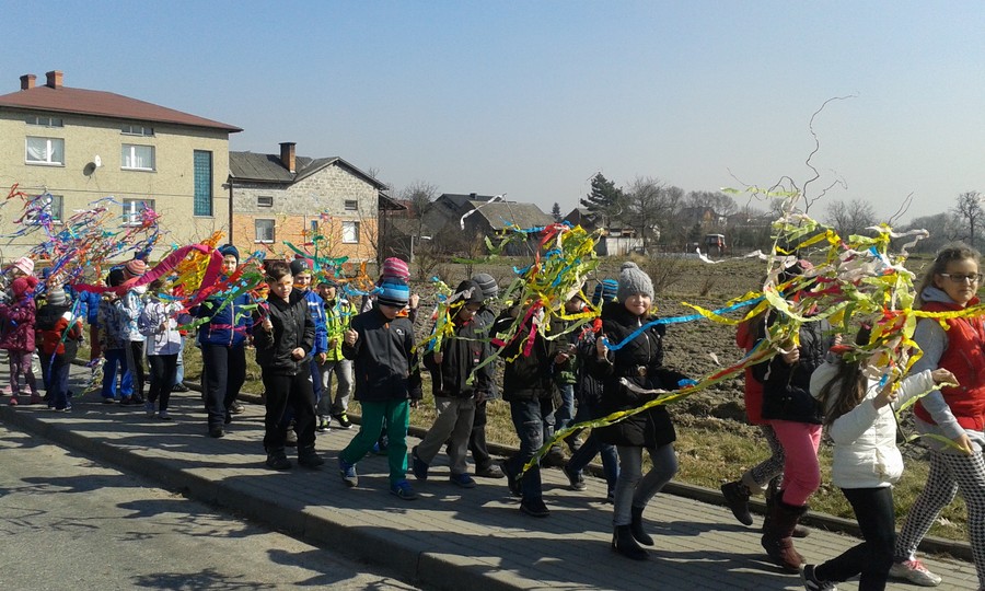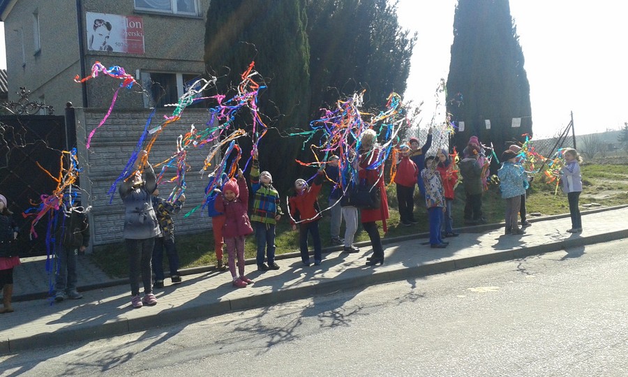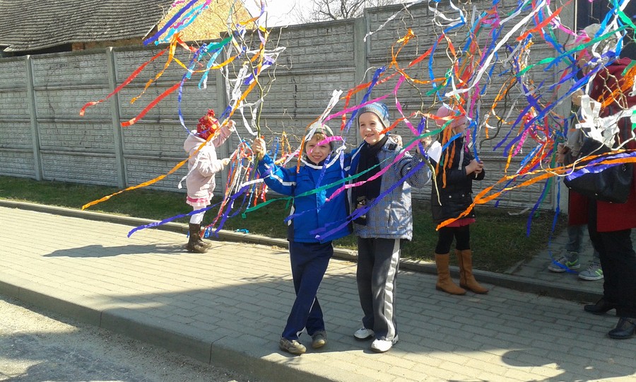 Dzieci pięknie zarecytowały wierszyki, przedstawiły inscenizację oraz zaśpiewały piosenki. Następnie wszyscy wesołym korowodem z kolorowymi gaikami wyruszyli pożegnać zimę i powitać nadejście wiosny.