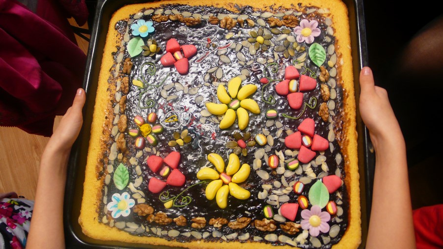 Uczniowie klasy trzeciej artystycznie udekorowali słodkiego mazurka. Na pysznym wypieku znalazły się orzechy różnego gatunku, pestki dyni, bananowe i malinowe żelki, listki i opłatkowe kwiatki później wykonali misterne rysunki pisakami do ciast przedstawiające symbole wielkanocne takie jak: baranek, zajączek, kurczątko oraz jajka.