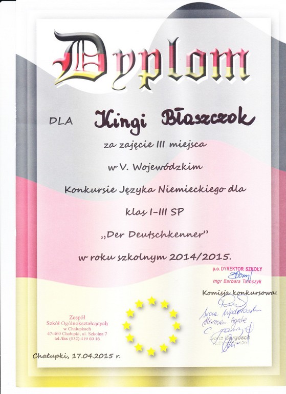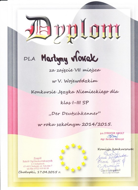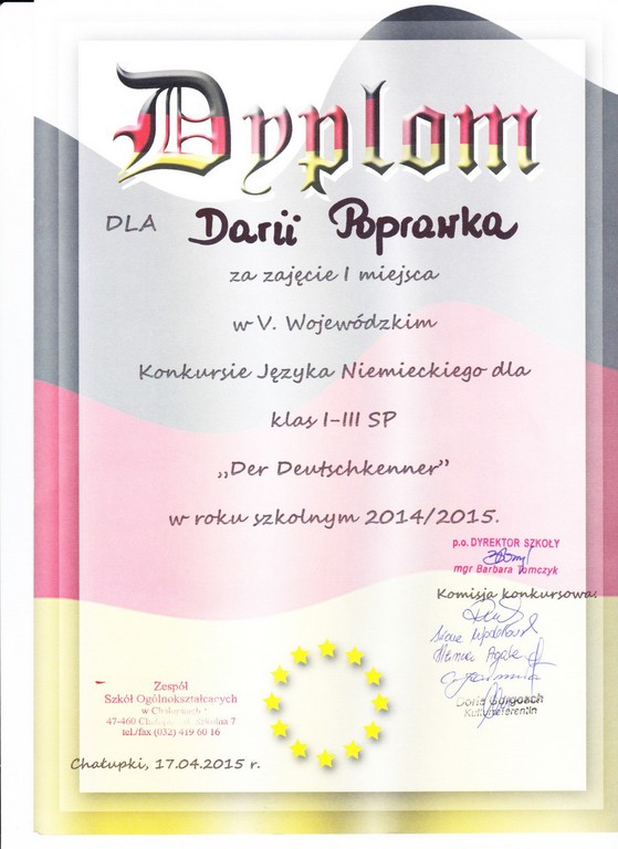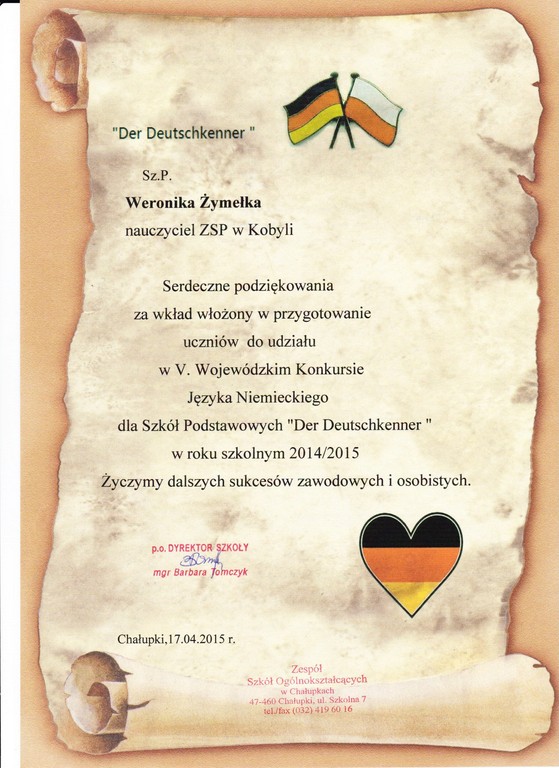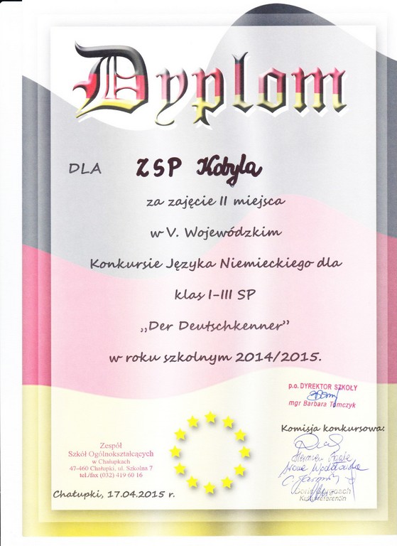 17 kwietnia w Zespole Szkół Ogólnokształcących w Chałupkach przeprowadzony został Wojewódzki konkurs z języka niemieckiego „Der Deutschkenner” dla klas I-III szkoły podstawowej, zorganizowany we współpracy z Towarzystwem Społeczno-Kulturalnym Niemców Województwa Śląskiego. W rywalizacji wzięło udział 20 szkół z całego województwa śląskiego. Konkurs składał się z dwóch części. W pierwszym etapie 3-osobowe reprezentacje szkół rozwiązywały zadania drużynowo. W następnej części zmagali się ze sobą indywidualnie uczniowie spośród 5 najlepszych drużyn. Konkurs miał na celu wyłonić „Najlepszego znawcy języka niemieckiego klas I-III”. Drużyna z Zespołu Szkolno-Przedszkolnego w Kobyli zdobyła II miejsce drużynowo i tym samym awansowała do drugiego etapu konkursu. W zmaganiach indywidualnych także zajęliśmy wysokie lokaty. Oto indywidualni laureaci Wojewódzkiego konkursu z języka niemieckiego dla klas I-III: