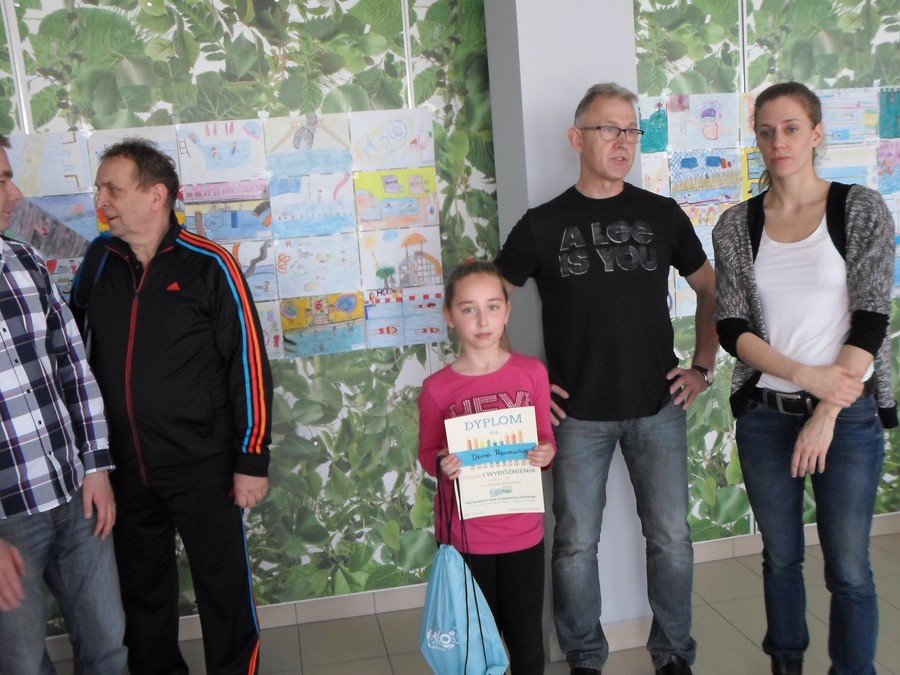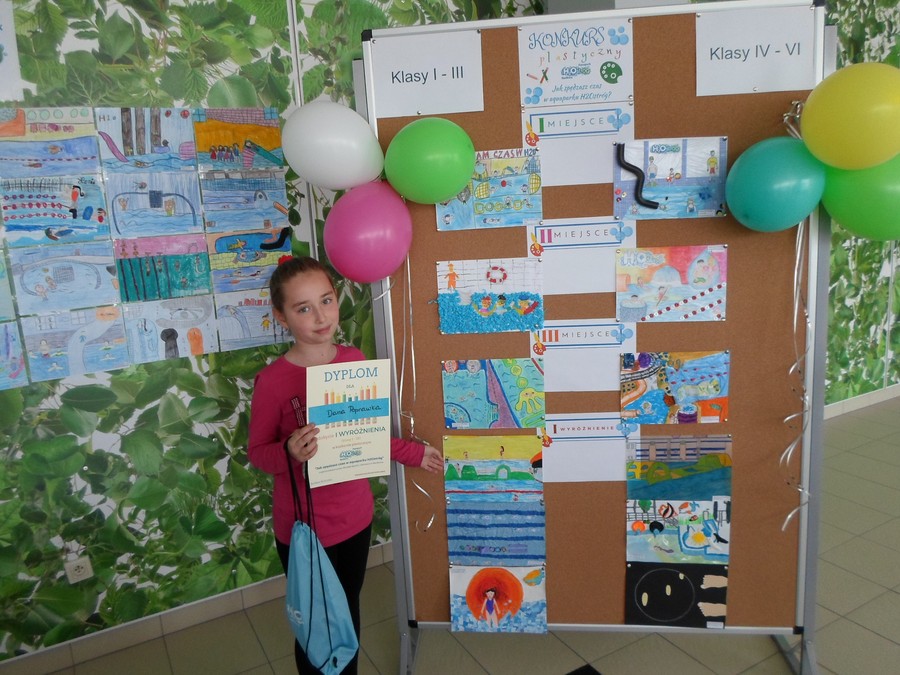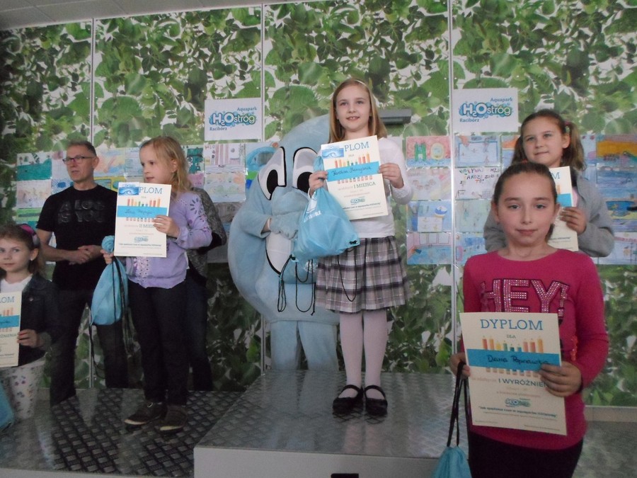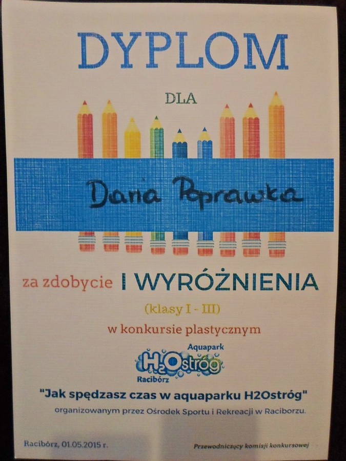 Uczniowie naszej szkoły brali udział w konkursie plastycznym organizowanym przez Ośrodek Sportu i Rekreacji w Raciborzu. Temat: „Jak spędzasz czas w Aquaparku H2Ostróg?” Komisja wyłoniła zwycięzców spośród 120 nadesłanych prac plastycznych. Członkami jury byli przedstawiciele Urzędu Miasta Racibórz i OSiR-u. Uczennica klasy III, Daria Poprawka otrzymała w tym konkursie I wyróżnienie w kategorii klas I - III i została zaproszona na rozdanie dyplomów i nagród. Wręczenie nagród oraz wystawa pokonkursowa odbyła się 1 maja, punktualnie w południe w budynku pływalni. Nagrody zwycięzcom wręczali Mirosław Lenk, prezydent Raciborza oraz Katarzyna Dulian, Wicemistrzyni Europy w pływaniu. Gratulujemy Darii bardzo serdecznie !