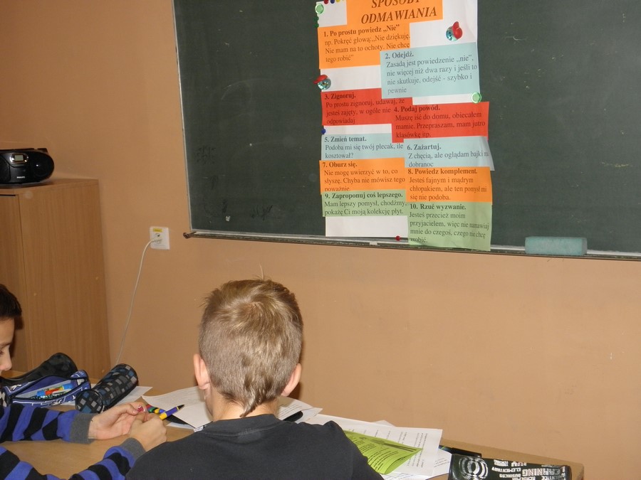 WARSZTAT III – Naucz się mówić „NIE” dał możliwość poznania postaw jakie przyjmują ludzie w kontaktach z innymi, uczniowie uświadomili sobie przyczyny zachowań agresywnych, uległych i asertywnych. Uczyli się także umiejętności mówienia „nie” w sytuacjach namawiania.