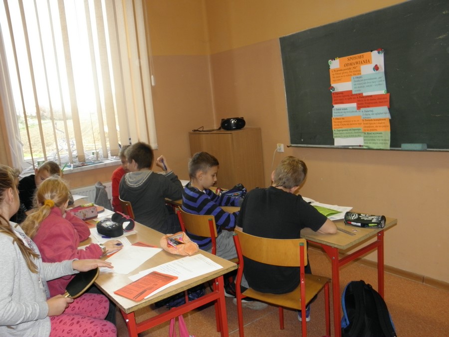 Realizację programu profilaktyki palenia tytoniu „Znajdź właściwe rozwiązanie” w roku szkolnym 2014/2015 uczniowie klasy V rozpoczęli od wstępnego testu wiedzy o nałogu nikotynowym, który pozwolił sprawdzić zakres wiedzy uczniów na temat tego problemu. Następnie uczniowie wzięli udział w cyklu zajęć warsztatowych realizowanych zgodnie z przyjętym harmonogramem.