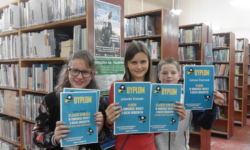 Dziś w Miejskiej i Powiatowej Bibliotece Publicznej im. Ryszarda Kincla w Raciborzu, odbył się Konkurs Wiedzy o Ruchu Drogowym. W konkursie wzięło udział dwadziescioro siedmioro uczestników z dziewieciu szkół podstawowych powiatu raciborskiego. Zadaniem każdego uczestnika bylo rozwiązanie testu który sprawdzał przepisy ruchu drogowego, znajomość udzielania pierwszej pomocy oraz zasady pierwszeństwa na skrzyżowaniach. Naszą szkołę reprezentowała trzyosobowa drużyna w skladzie: Julia Herok z kl. VI, Jolanta Krasek z kl. V