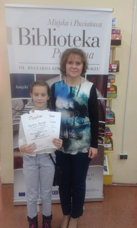 W piątek 23 października uczennica klasy trzeciej Karolina Zaczyk ze Szkoły Podstawowej w Kobyli zajęła II miejsce w Powiatowym Konkursie Pięknego Pisania „Zostań Mistrzem Kaligrafii ” w Raciborzu. Laureatce Gratulujemy!