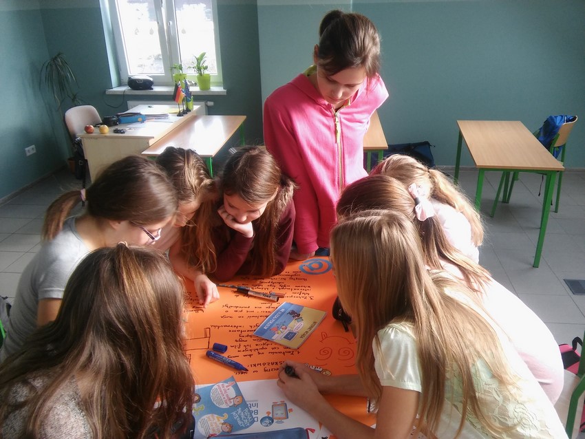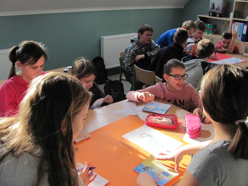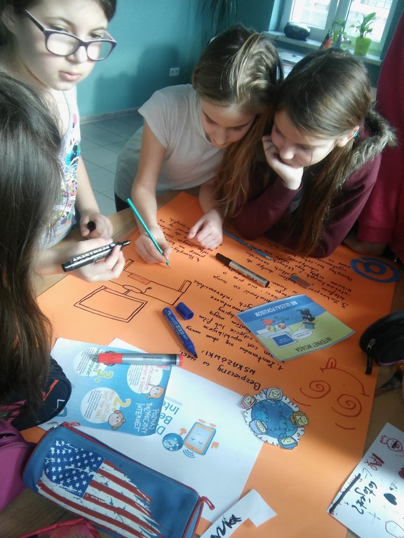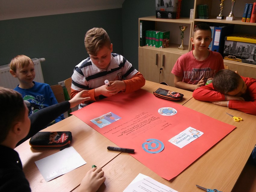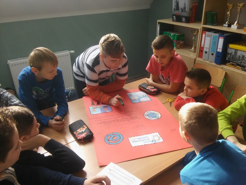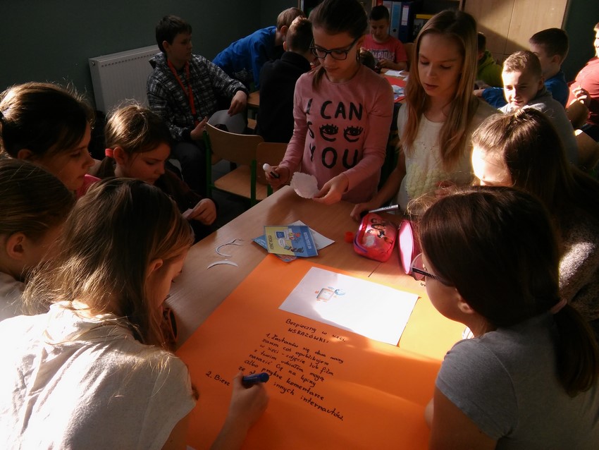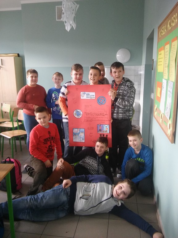 Uczniowie klas starszych już od dwóch tygodni na lekcjach z zajęć komputerowych rozmawiali na temat bezpieczeństwa w internecie. Poznali pojęcia takie jak netykieta i cyberprzemoc. Klasa czwarta korzystając z edytora tekstowego tworzyła regulamin bezpieczeństwa w internecie i spisała zasady netykiety. Klasa piąta na lekcjach wychowawczych rozmawiała na temat kulturalnego i bezpiecznego korzystania z internetu. Końcowym efektem zajęć warsztatowych było utworzenie plakatów.