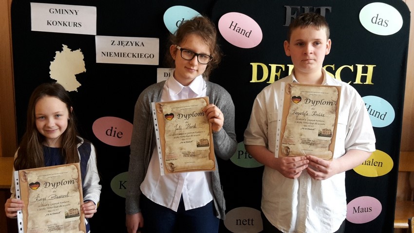 18 marca w Zespole Szkolno-Przedszkolnym w Rzuchowie odbył się Gminny Konkurs Języka Niemieckiego dla klas IV-VI szkół podstawowych pt. „FIT IN DEUTSCH”. Naszą szkołę w zmaganiach językowych reprezentowali: Kinga Błaszczok (kl. IV), Krzysztof Krolik (kl. V) oraz Julia Herok (kl. VI). Celem konkursu było rozbudzenie zainteresowań lingwistycznych uczniów oraz zachęcenie ich do poznawania kultury, geografii i historii krajów niemieckojęzycznych. Każdy uczestnik miał do rozwiązania test pisemny, który zawierał zadania sprawdzające rozumienie ze słuchu, rozumienie tekstu czytanego oraz zadania leksykalno-gramatyczne.