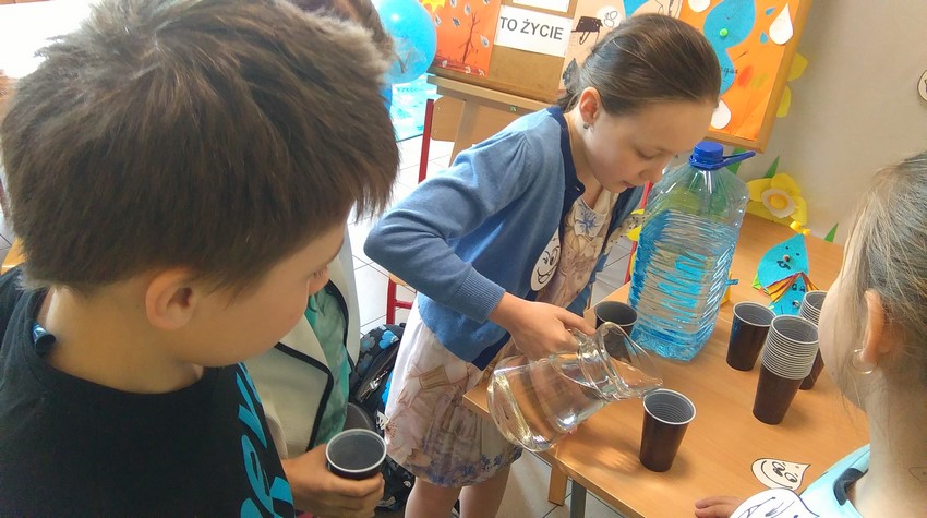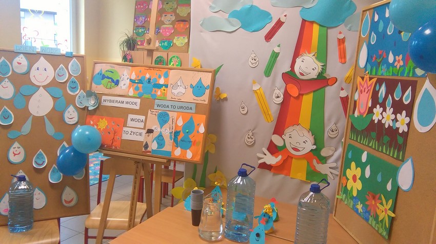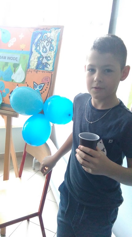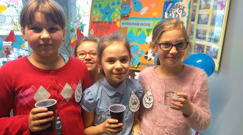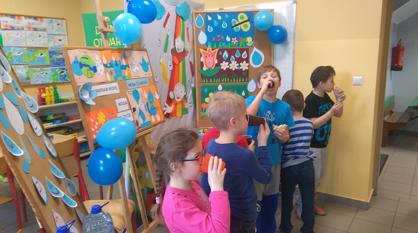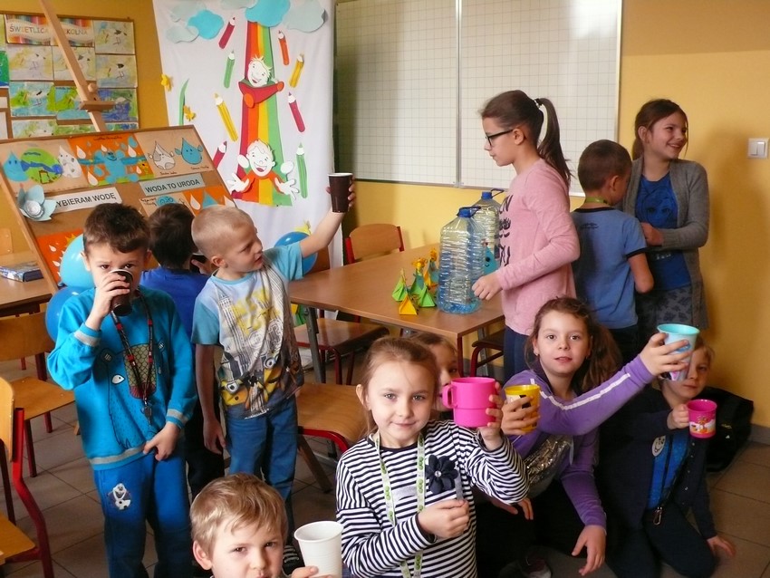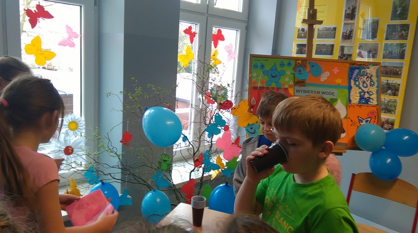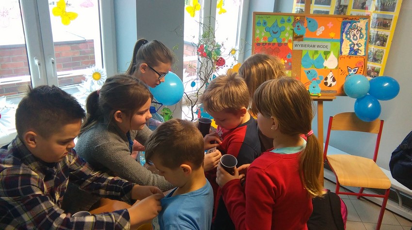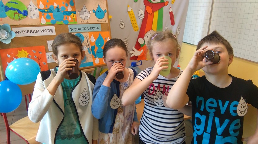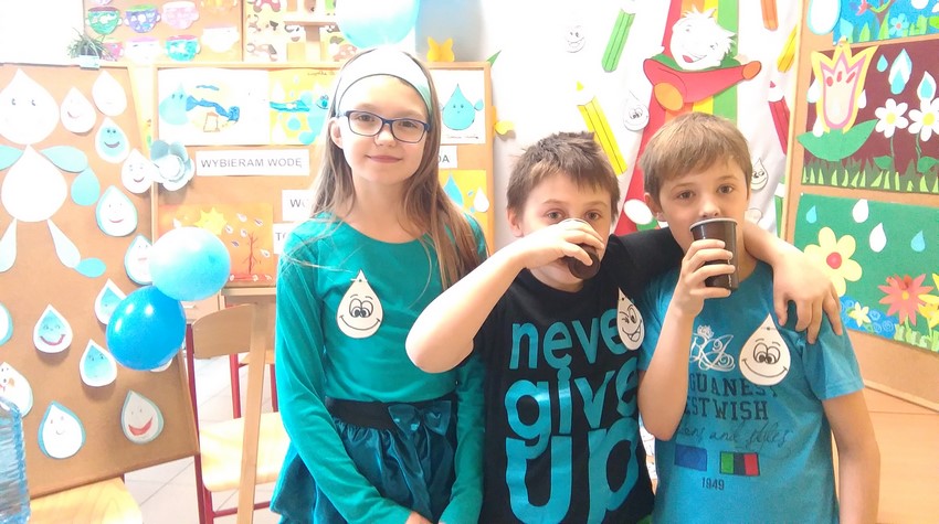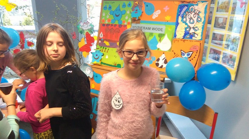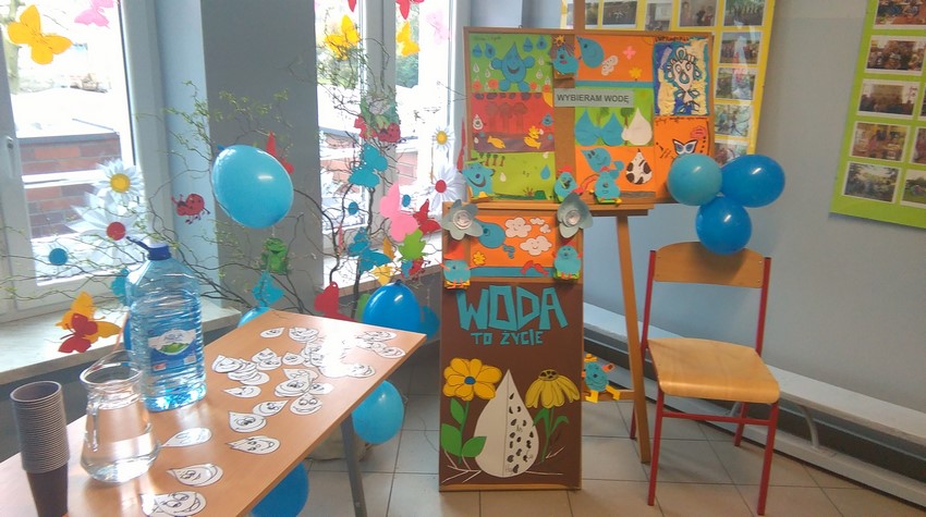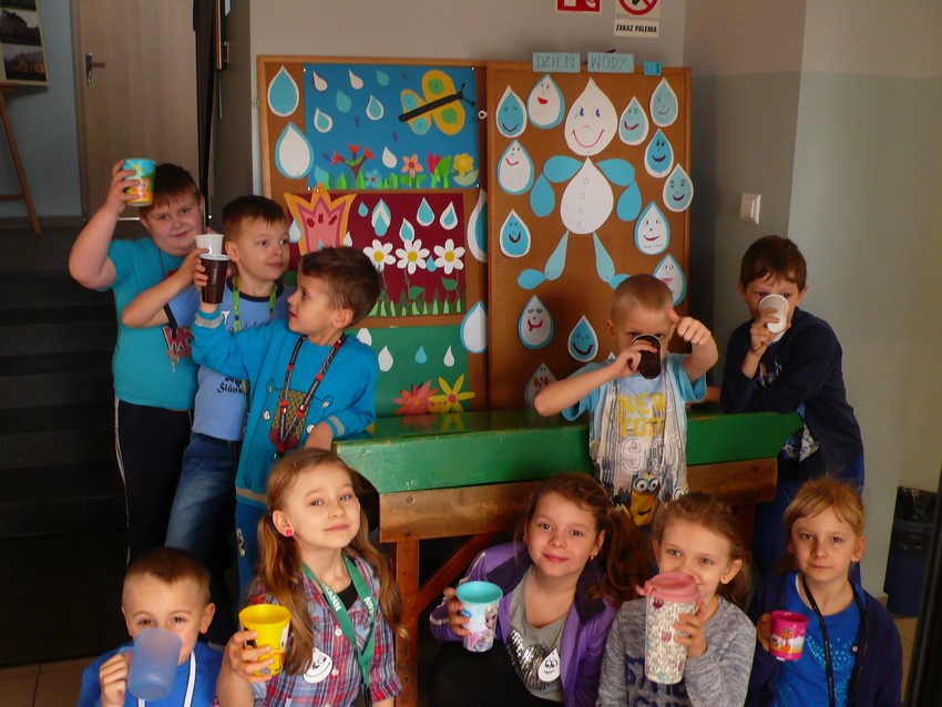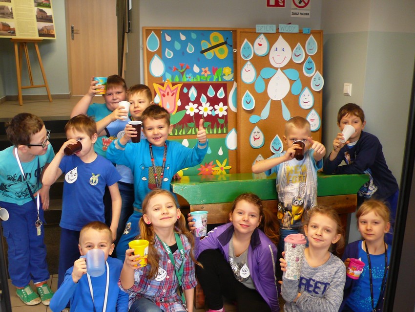 22 marca obchodziliśmy w naszej szkole Światowy Dzień Wody. To czas, kiedy więcej rozmawiamy o oszczędzaniu wody, o zastępowaniu wodą wszelakich sztucznych napojów, o prawidłowej gospodarce wodą. Uczniowie na lekcjach przypomnieli sobie, jak wielkie znaczenie ma woda pitna w naszym życiu i dlaczego powinniśmy właśnie ją wybierać. Wykonali również wiele pięknych prac plastycznych, które ozdobiły nasze stoiska, gdzie wszyscy mogli się napić czystej, orzeźwiającej wody. Każdemu kto wypił kubeczek wody przyczepiono do ubrania uśmiechniętą kropelkę. Aby uczcić ten dzień, uczniowie mogli przyjść ubrani na niebiesko. Z tej okazji będziemy również organizować akademię szkolną, połączoną z Dniem Ziemi. Nasze hasło na ten dzień to WYBIERAM WODĘ.