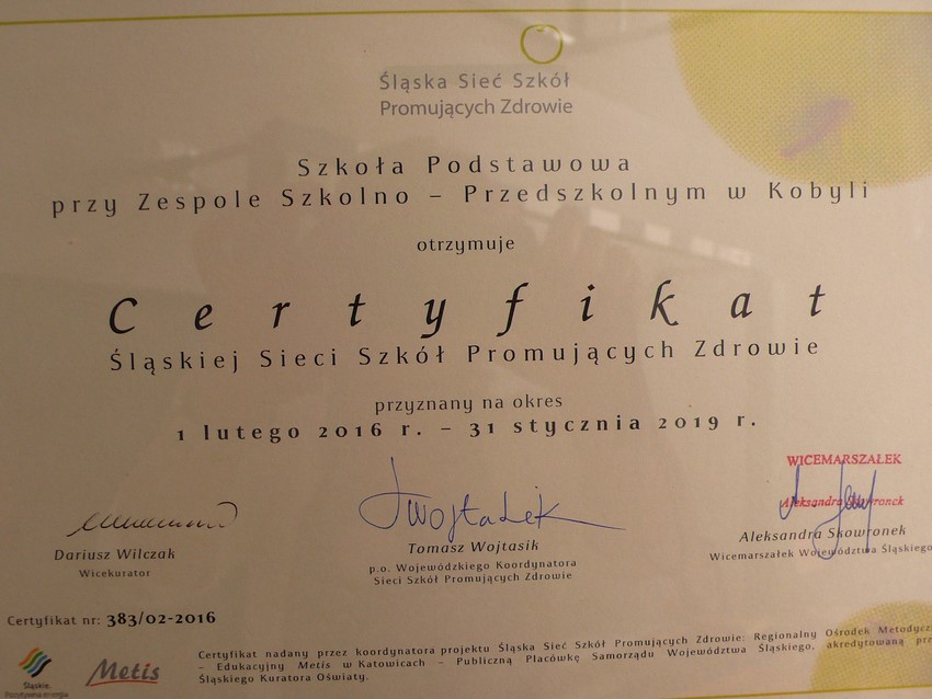 W środę, 13 kwietnia 2016 r. szkoła w Kobyli świętowała doniosłe wydarzenie. W tym dniu odwiedziła naszą szkołę pani Barbara Dobias-Mola - Wojewódzki Koordynator z Regionalnego Ośrodka Metodyczno-Edukacyjnego w Katowicach, by wręczyć nam Certyfikat Śląskiej Sieci Szkół Promujących Zdrowie.