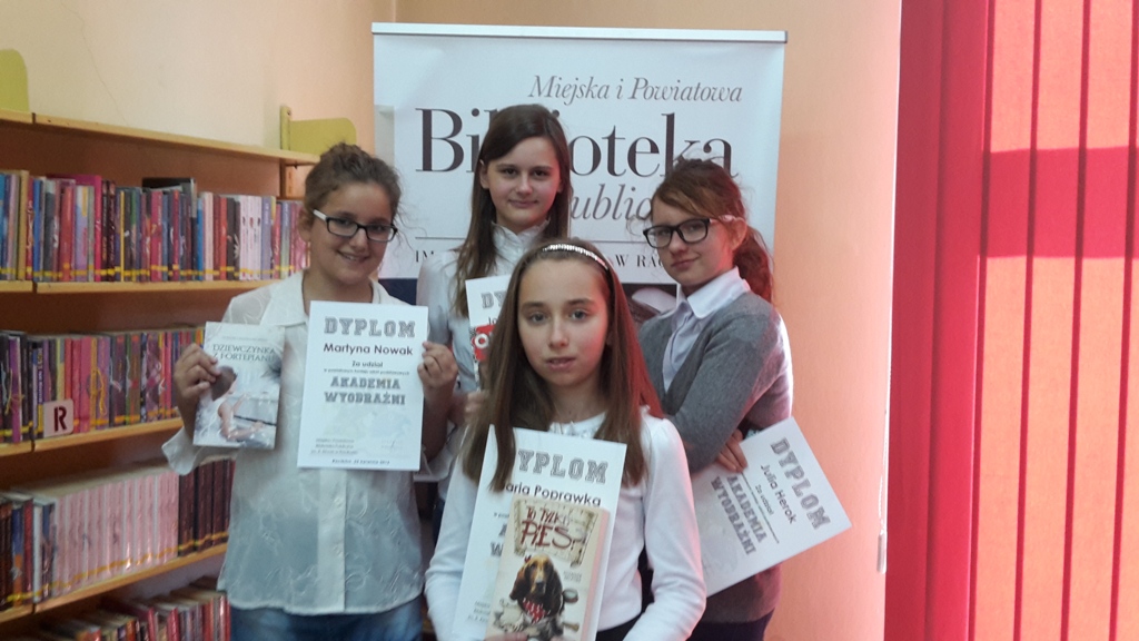 22 kwietnia w Miejskiej i Powiatowej Bibliotece Publicznej im. Ryszarda Kincla w Raciborza odbył się powiatowy turniej czytelniczy dla uczniów szkół podstawowych z Raciborza i powiatu raciborskiego pod hasłem „Akademia wyobraźni”. Konkurs został zorganizowany z okazji Światowego Dnia Książki i Praw Autorskich. Naszą szkołę reprezentowały: Daria Poprawka (kl. IV), Martyna Nowak (kl. IV), Jolanta Krasek (kl. V) oraz Julia Herok (kl. VI). Uczestnicy zmagań musieli wykazać się znajomością treści następujących książek: J. Brzechwa – „Akademia Pana Kleksa”, A. Maleszka – „Magiczne drzewo”, E. Nesbit – „Pięcioro dzieci i coś”. Dodatkowo każda drużyna miała do wykonania plakat reklamujący wybraną przez siebie książkę oraz zaprezentować przygotowaną wcześniej scenkę teatralną opartej na treści wybranej książki.