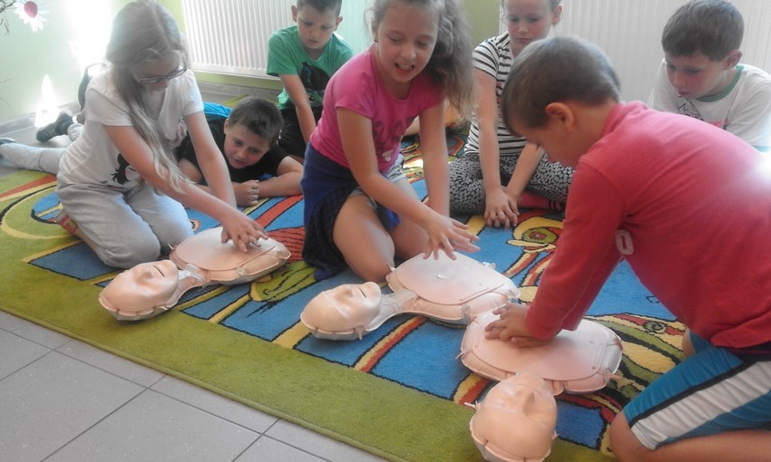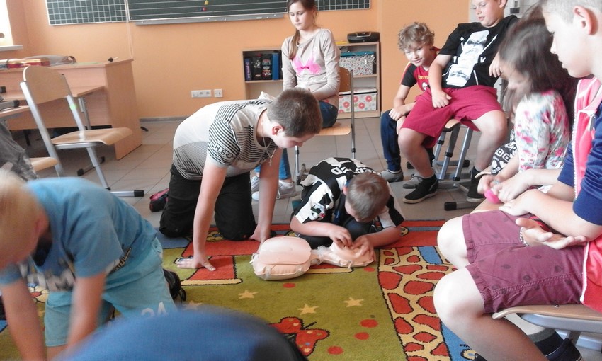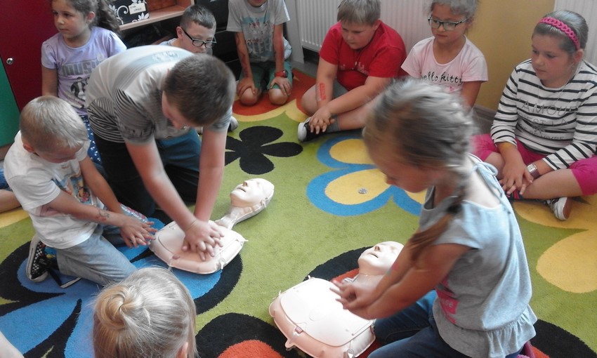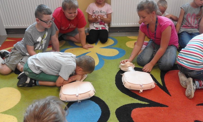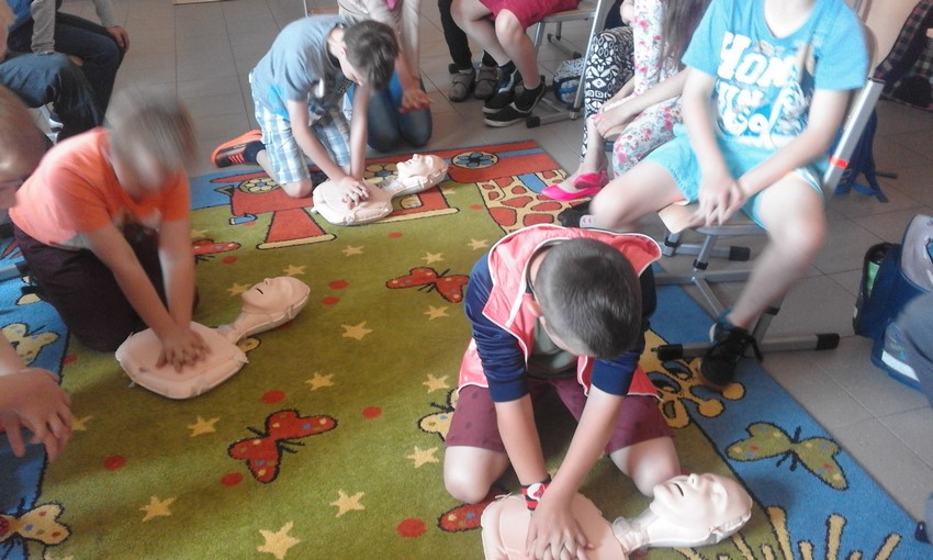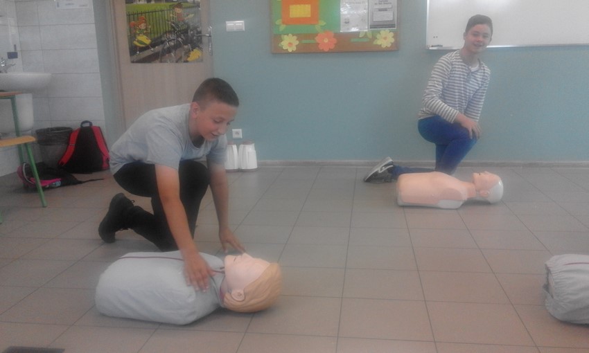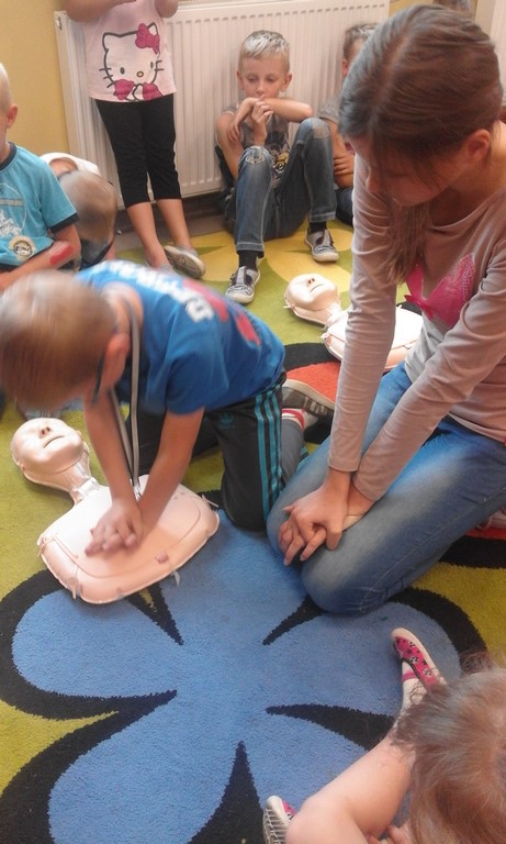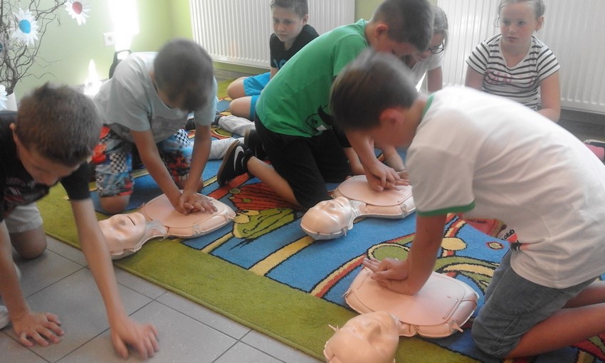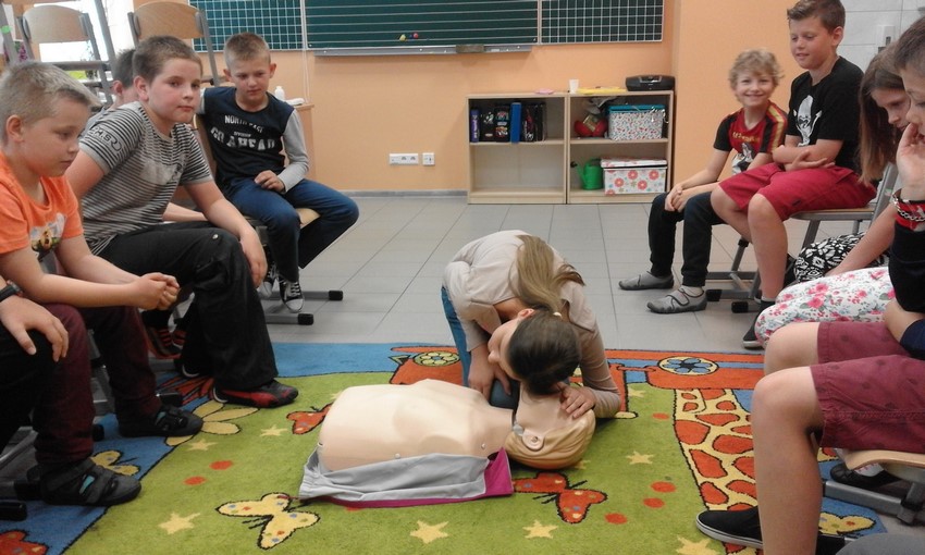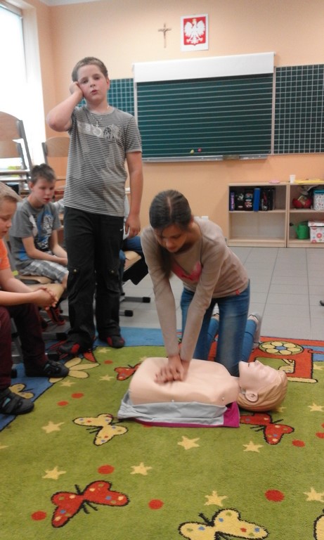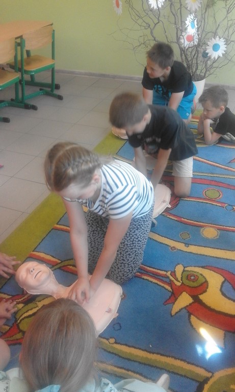 Co roku, przed wakacjami letnimi, włączamy się w Ogólnopolską Akcję Wielkiej Orkiestry Świątecznej Pomocy „Ratujemy – uczymy ratować” i prowadzimy w szkole lekcje z zakresu resuscytacji krążeniowo-oddechowej. Uczniowie wszystkich klas uczestniczą w praktycznych warsztatach, podczas których uczą się prawidłowo oceniać stan poszkodowanego (sprawdzić oddech, przytomność, wykonać wdechy ratownicze i masaż serca), uczą się również prawidłowo zawiadamiać odpowiednie służby ratownicze i zabezpieczać teren wokół wypadku. Podczas warsztatów zwraca się również szczególną uwagę na dbanie o bezpieczeństwo własne. W tym roku szkolnym warsztaty poprowadzili uczestnicy zajęć „Bezpieczeństwo w Ruchu Drogowym” – Jola i Łukasz z klasy V. Uczniowie, nie tylko imponowali kolegom i koleżankom teoretyczną wiedzą z zakresu udzielania pierwszej pomocy, prezentowali też praktyczne umiejętności i dzielili się swoimi umiejętnościami z innymi. Wszyscy uczniowie chętnie uczestniczyli w zajęciach i podejmowali próby ratowania oraz wzywania pomocy, tak, by gdy zajdzie taka potrzeba, wykorzystać zdobyte umiejętności w praktyce i nieść pomoc potrzebującym.