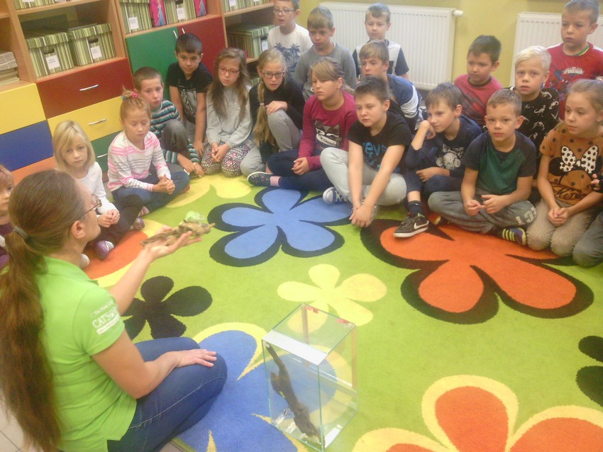 21 września do naszej szkoły zaprosiliśmy niezwykłych gości. Dzieci z klas młodszych odwiedziła pani Michalina Fojcik ze swoimi egzotycznymi podopiecznymi: agawą brodatą, żółwiem, pytonem oraz kameleonem. Dzieci podziwiały te niezwykłe gady, obserwowały ich zachowanie, zachwycały się ich przepięknym wyglądem, a także mogły je dotknąć. Z zainteresowaniem wsłuchiwały się w opowieści o ich życiu, żywieniu i opiece nad nimi w warunkach domowych. Na koniec wizyty uczniowie otrzymali kolorowanki z poznanymi zwierzątkami. Pani Michalina obiecała odwiedzić ponownie naszą szkołę ,aby dzieci mogły poznać kolejne egzotyczne zwierzątka.