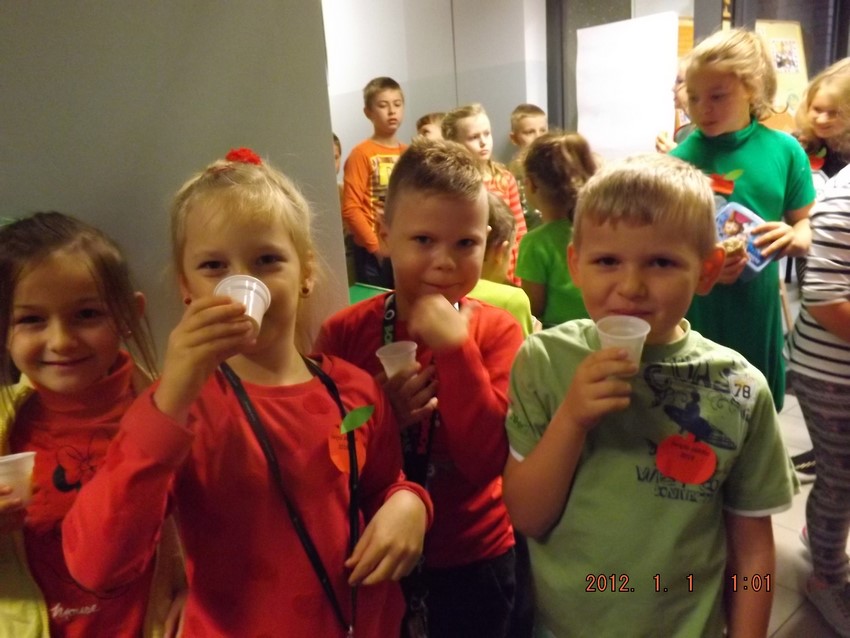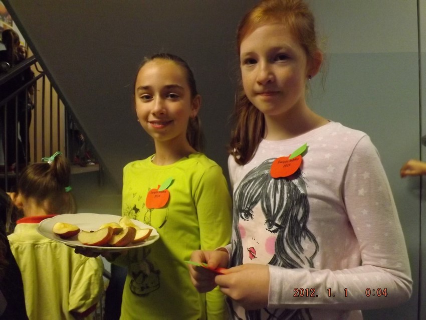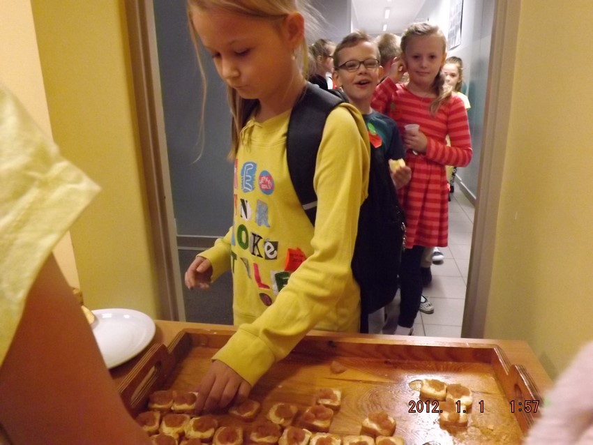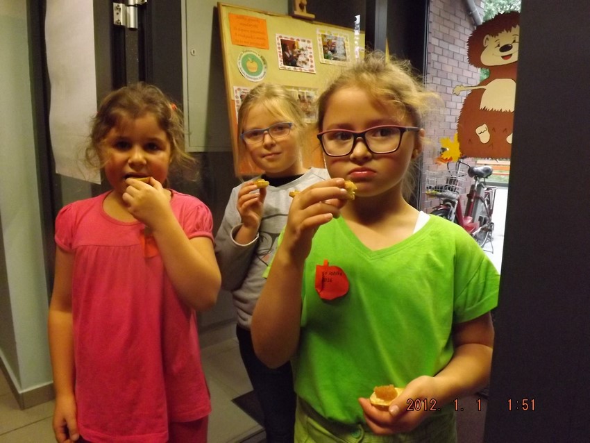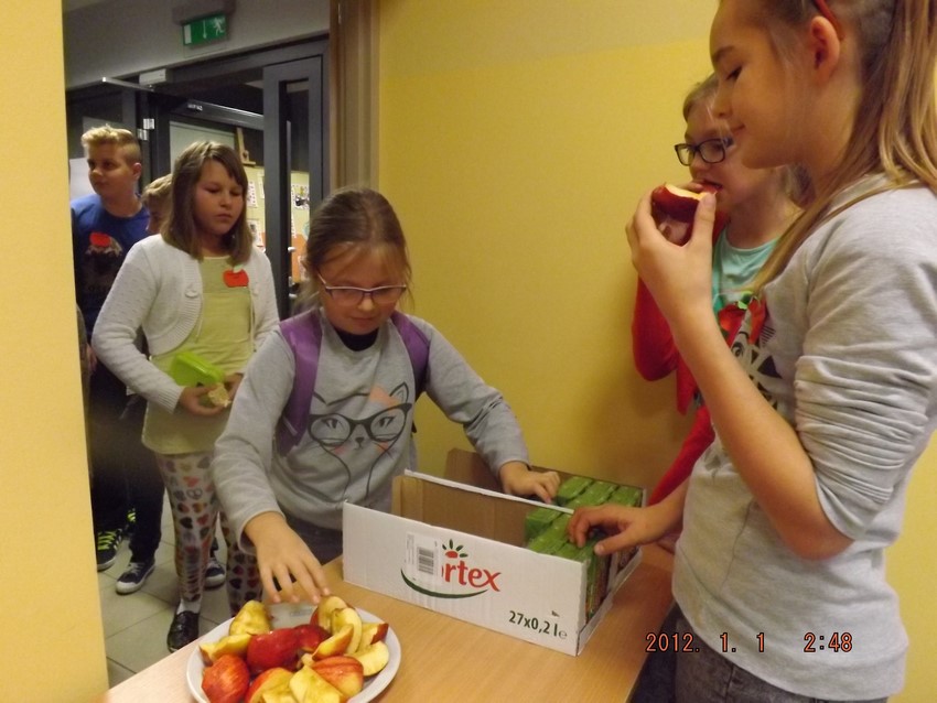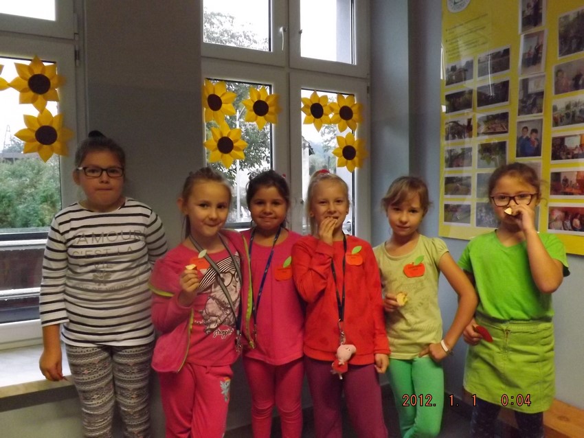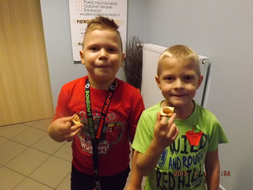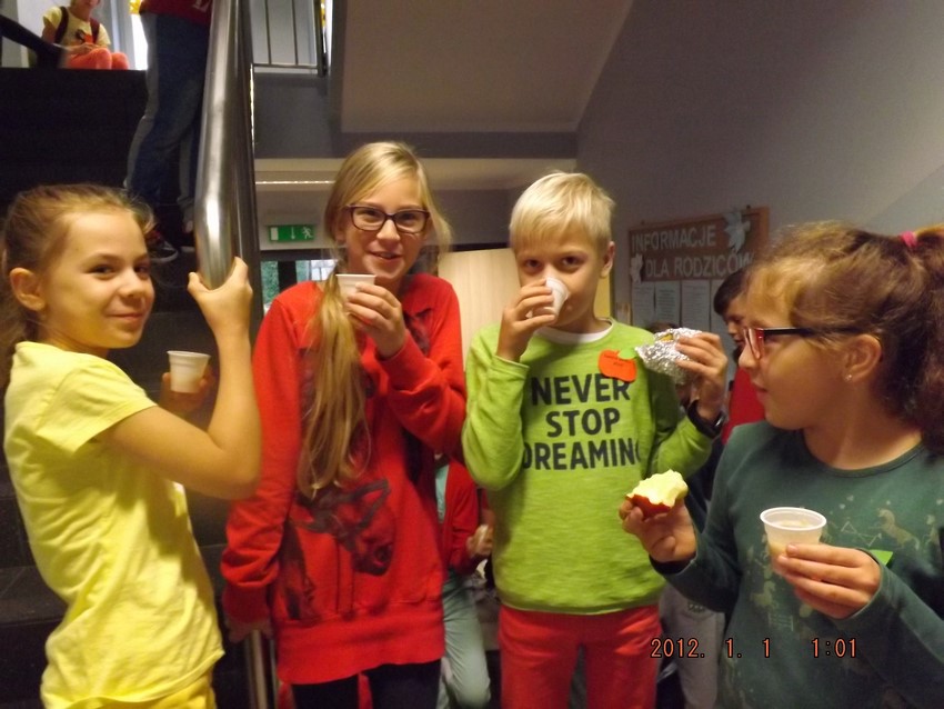 Jabłko, najpopularniejszy owoc, bogaty w witaminy i wartości odżywcze, ma również swoje święto. W naszej szkole obchodziliśmy je 12 października. Na ten dzień zaplanowaliśmy wiele atrakcji, by w ciekawy sposób zachęcać uczniów do jedzenia jabłek zarówno surowych, jak i w postaci różnych przetworów. Oprócz częstowania uczniów słodkimi i soczystymi jabłkami, wyciskaliśmy świeży sok jabłkowy, przygotowywaliśmy kanapki z jabłkowym musem, a na deser wszyscy otrzymali soczki – oczywiście jabłkowe. W tym dniu obowiązywały kolory jabłka: czerwony, żółty Oraz zielony i cieszymy się bardzo, że tak wielu uczniów przyłączyło się do naszej akcji. Serdecznie dziękujemy państwu Anicie i Mariuszowi Dąbrowskim, którzy zasponsorowali smaczne jabłka i soczki dla wszystkich uczniów.