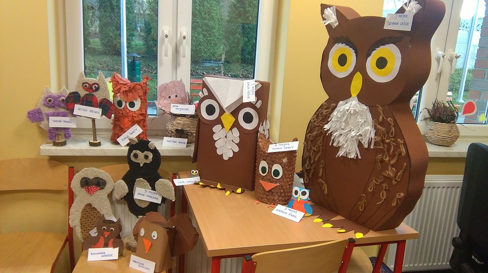 Konkurs plastyczny "Biblioteczna Sówka" - uczniowie całej szkoły głosowali w ubiegły piątek na najlepszą sówkę biblioteczną - I miejsce Szymon Cieślik, II miejsce Emilia Cieślik, III miejsce Tomasz Święty, IV miejsce Jakub Porębski, V miejsce Natalia Kowol. Wszystkie sówki są przepiękne i są ozdobą biblioteki szkolnej.