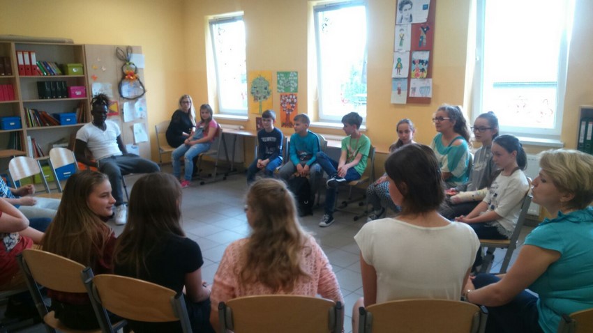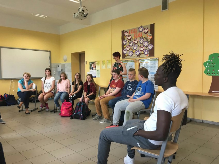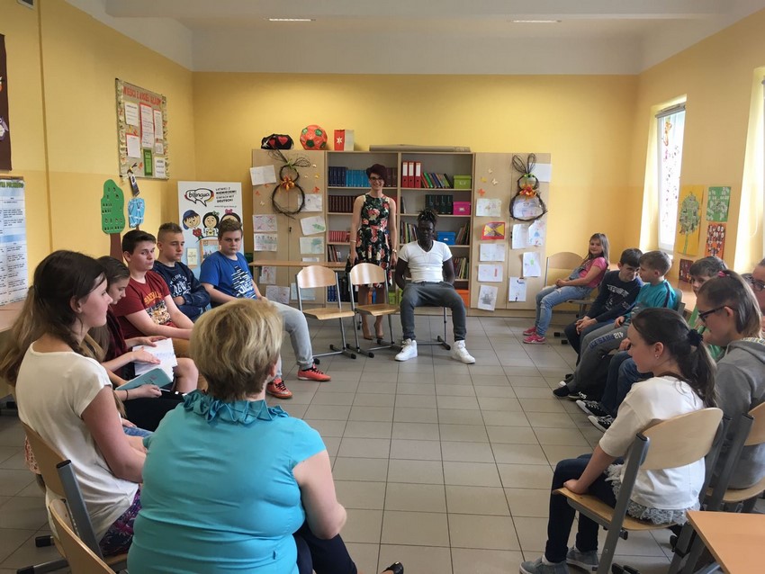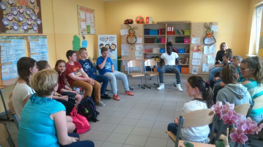 W piątek odwiedził nas w szkole niezwykły gość – mieszkaniec Kenii. Była to doskonała okazja dla uczniów klasy V i VI by dowiedzieć się czegoś o Kenii, o zwyczajach tam panujących i o nim samym. Była to też doskonała okazja by wykorzystać znajomość języka angielskiego, bo choć nasz gość znał parę słów po polsku (dzień dobry, dziękuję i jeszcze parę innych), to za mało by swobodnie porozmawiać. Mimo pewnych obaw i dużej dawki nieśmiałości na początku spotkania, chęć nawiązania konwersacji i zadania pytania przezwyciężyła strach a pytania posypały się jak z rękawa. Uczniów interesowało nie tylko życie w Kenii, pogoda, tradycyjne potrawy, drużyny piłkarskie, praca i czas wolny, ale również jego wrażenia po przylocie do Polski. Mieli też okazję posłuchać paru zdań wypowiedzianych w jego ojczystym języku – Suahili. Jak mówi angielskie przysłowie „time goes fast when you`re having fun”, czas leciał bardzo szybko i wkrótce spotkanie dobiegło końca. Jako pamiątkę uczniowie podarowali naszemu gościowi koszulkę z napisem Polska i wizerunkiem orła białego, która będzie mu przypominała o wizycie w naszej szkole.