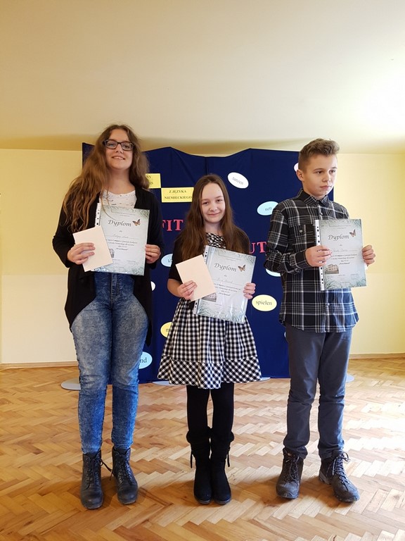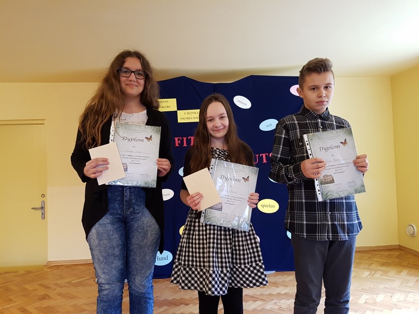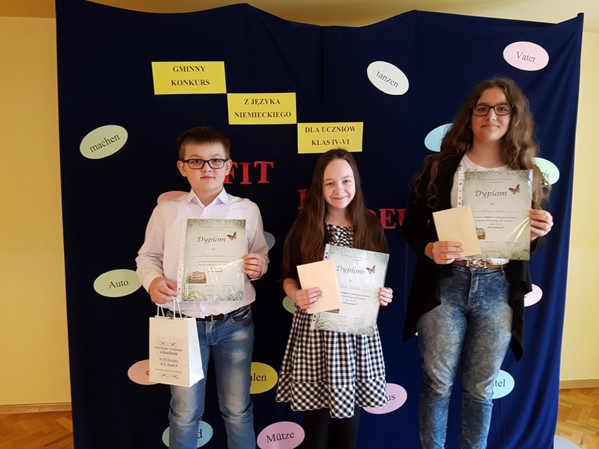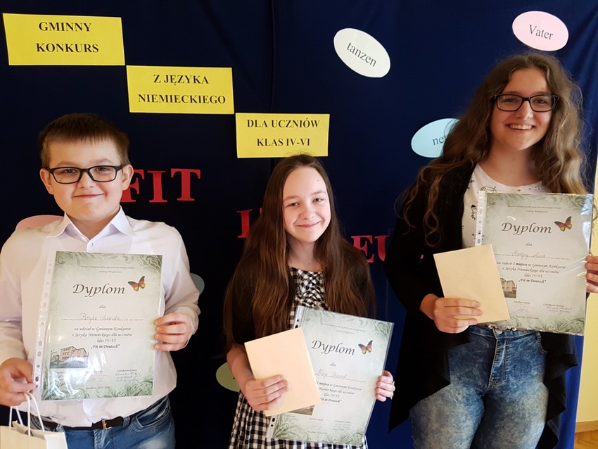 23 marca w Domu Kultury w Rzuchowie odbył się Gminny Konkurs Języka Niemieckiego dla klas IV-VI szkół podstawowych pt. „FIT IN DEUTSCH”. Naszą szkołę w zmaganiach językowych reprezentowali: Patryk Świerczek (kl. V), Kinga Błaszczok (kl. VI) oraz Martyna Nowak (kl. VI).