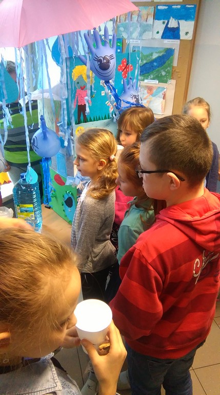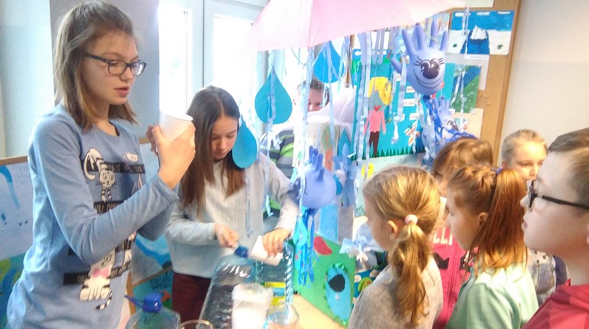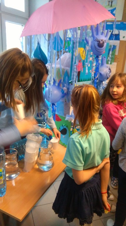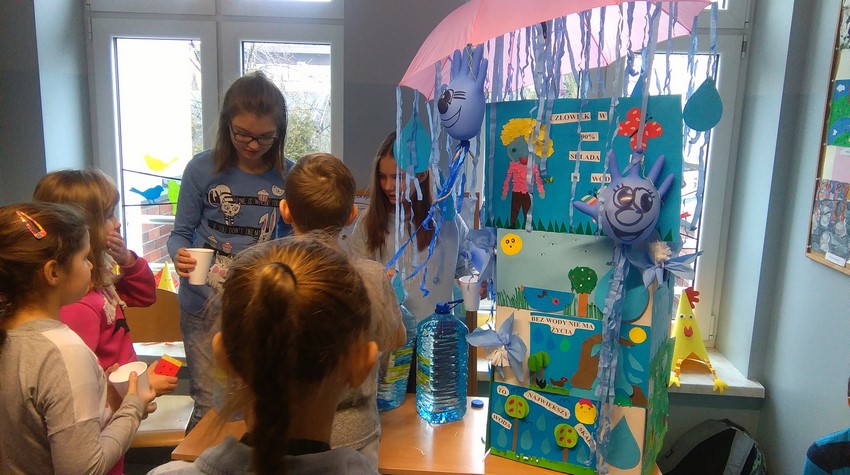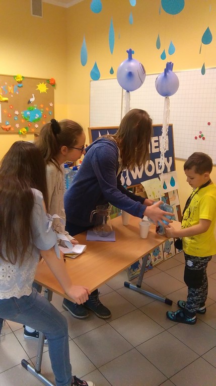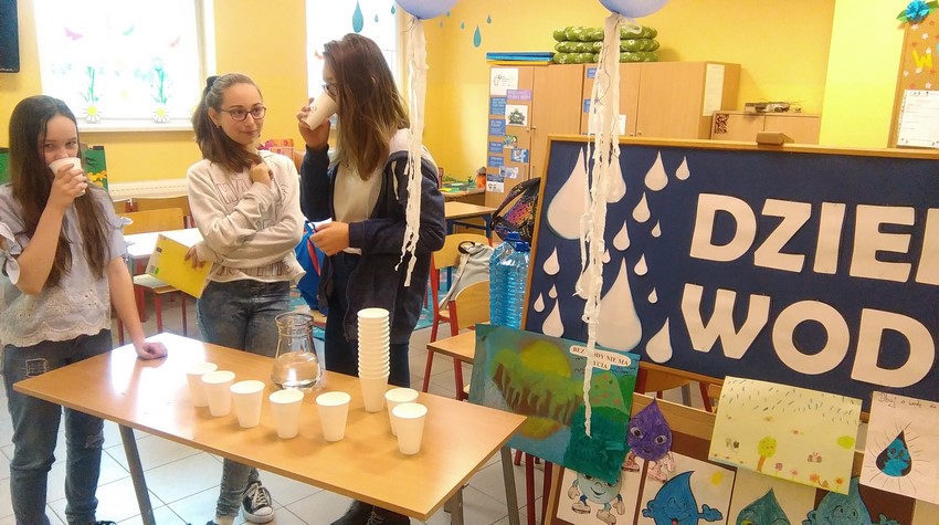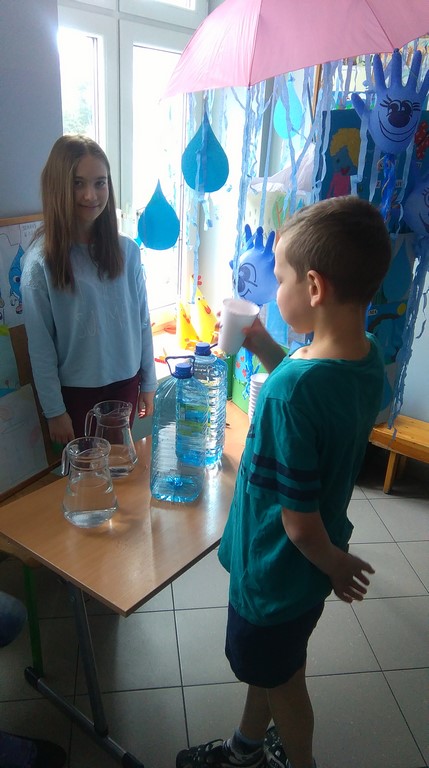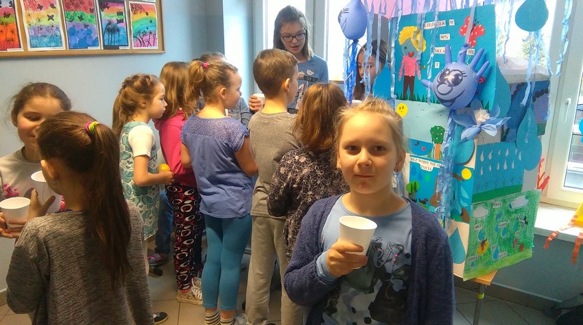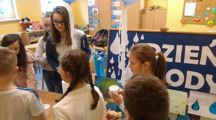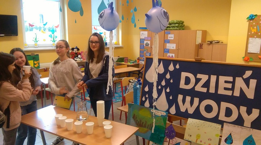 Czy potraficie sobie wyobrazić życie bez wody? Woda to dar! Jest nieodzownym elementem naszego życia! Nawet stanowi ponad 70% naszego organizmu! Nie ma życia bez wody! Dlatego korzystajmy z tego skarbu natury każdego dnia. Zastępujmy wodą słodzone napoje! Jednocześnie oszczędzajmy, by jej nigdy nie zabrakło. W naszej szkole w dniach około 22 marca, kiedy to obchodzi się Dzień Wody na całym świecie, nauczyciele na lekcjach przypomnieli uczniom o bezcenności wody. Uczniowie wykonali prace plastyczne, a 27 marca zorganizowaliśmy dzień picia wody. Dziewczynki z klas starszych częstowały uczniów i nauczycieli zimną, orzeźwiającą wodą. Dziękujemy naturze za SKARB ZWANY WODĄ i zachęcamy do korzystania z tego daru każdego dnia.
