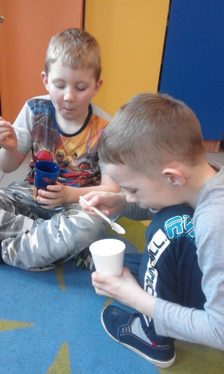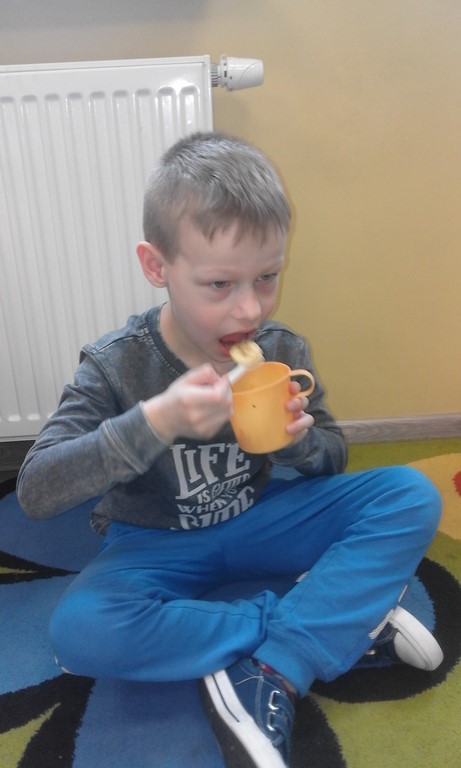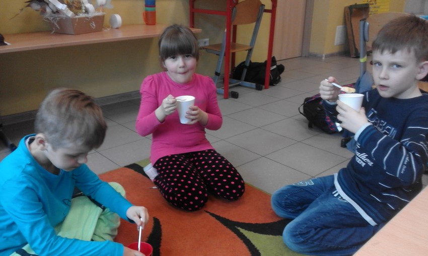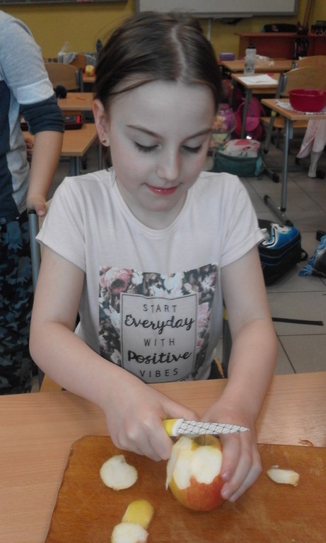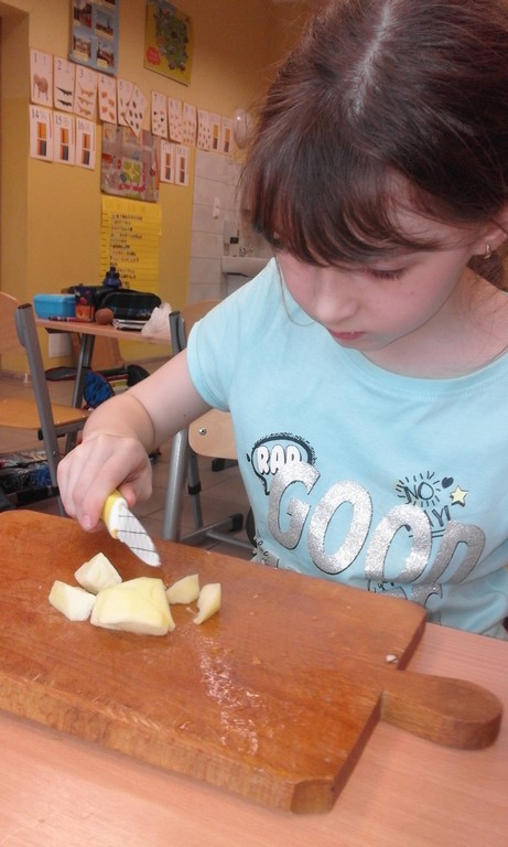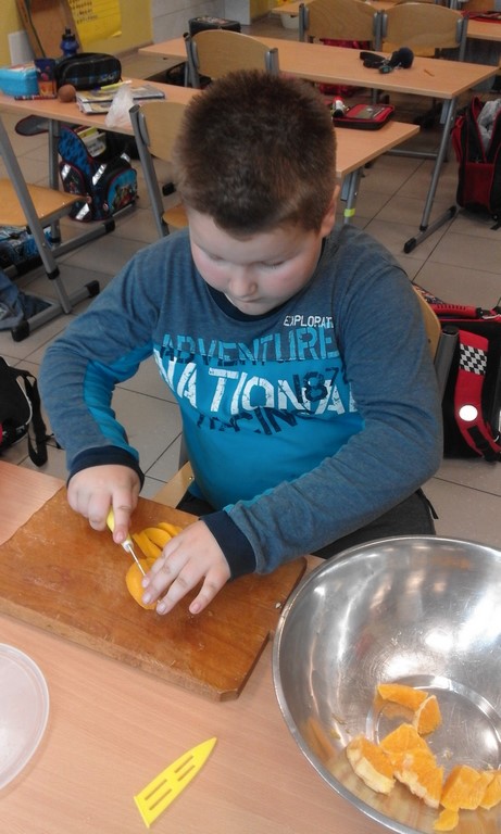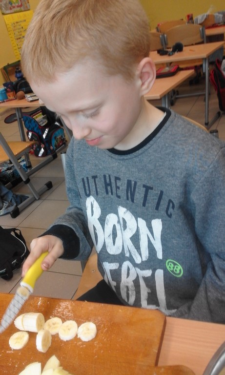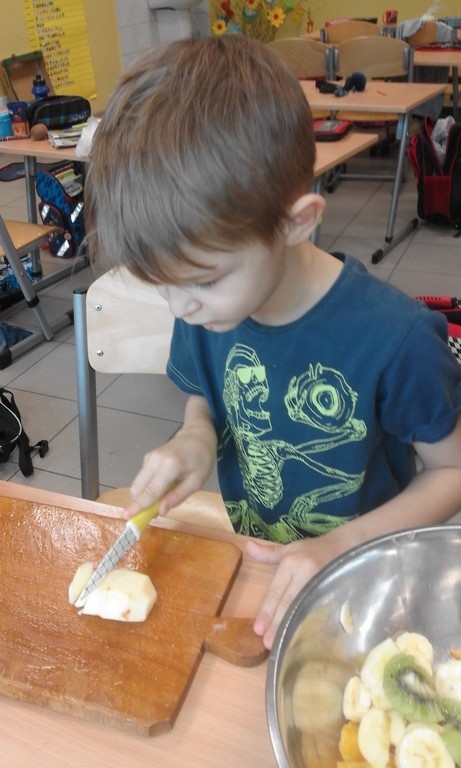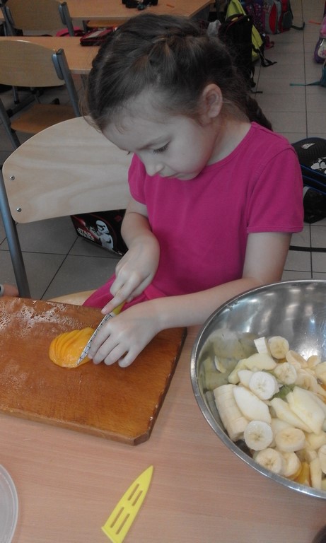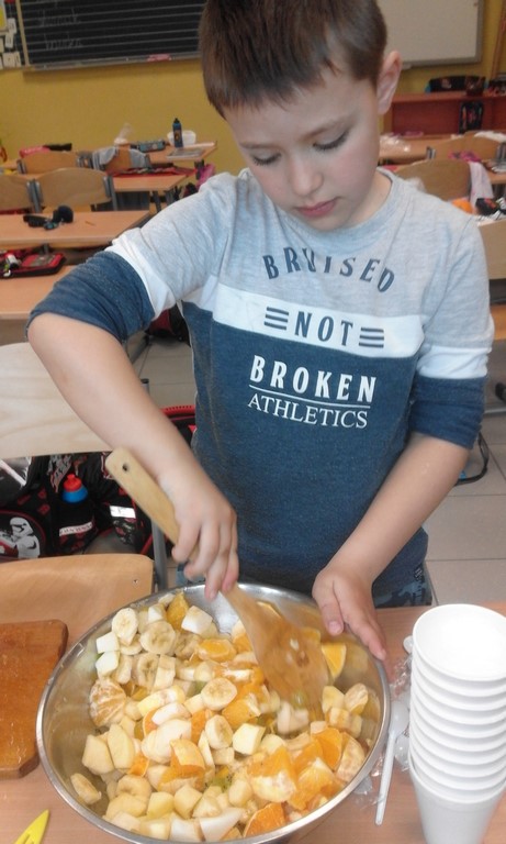 W piątek, na lekcji języka angielskiego pierwszoklasiści poznawali słówka związane z przygotowaniem jedzenia. Była to dobra okazja, by przekąsić małe co nieco i dla tego uczniowie wspólnie przygotowali pyszną sałatkę owocową. Oczywiście w sałatce znalazły się tylko te owoce, które pierwszaki potrafią nazwać w języku angielskim, a że znają ich dość sporo – sałatka była różnorodna i kolorowa i znikła w okamgnieniu.