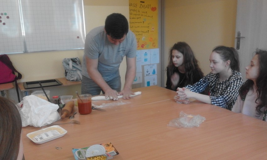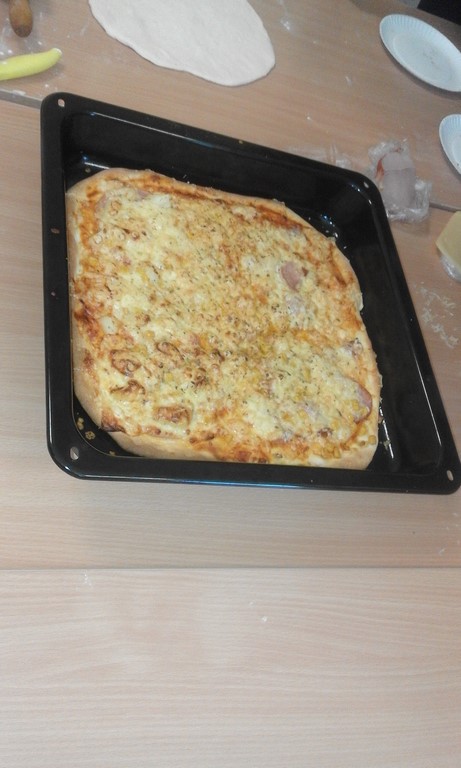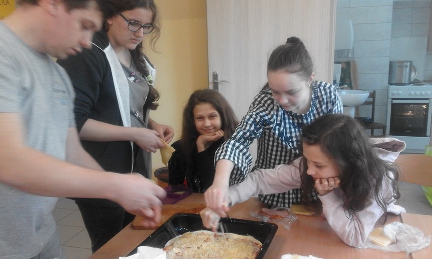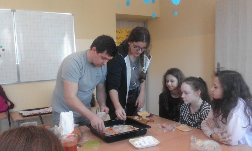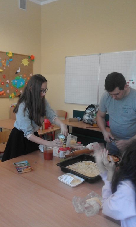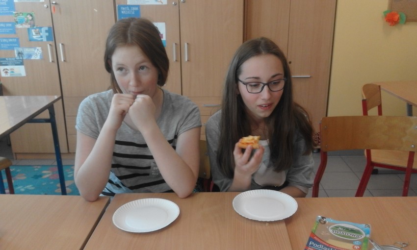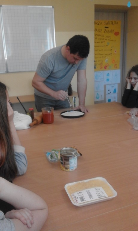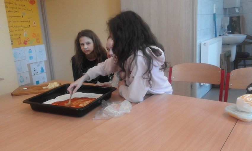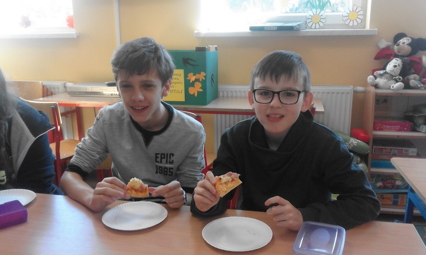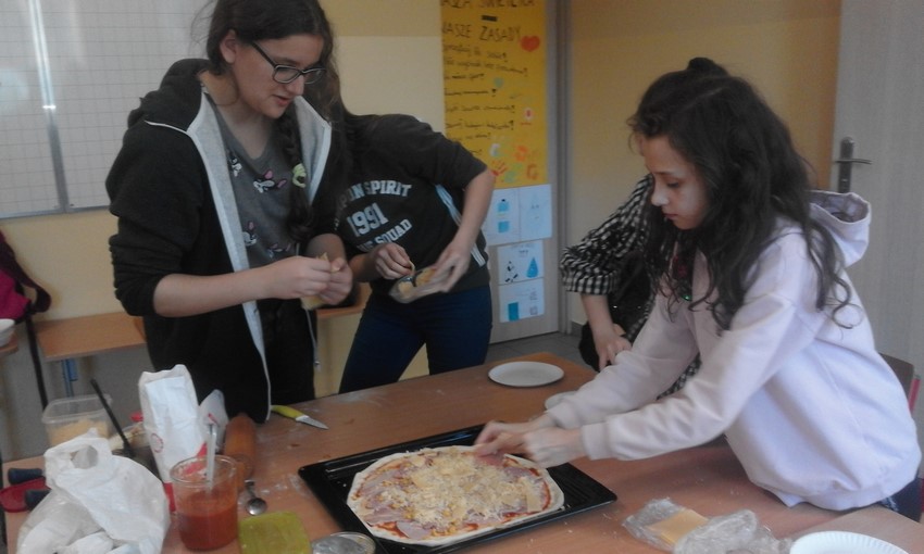 Szóstoklasiści to mają szczęście! Od kilku tygodni na zajęciach technicznych uczą sie o zasadach zdrowego odżywiania i zbilansowanej diety. A że teorię warto podeprzeć praktyką gotują to i owo. W tym tygodniu była to pizza w kilku odsłonach, którą pomógł profesjonalnie przygotować pan Adam - tata Karola. Najpierw ucziowie zobaczyli jak wyrabia się ciasto i robi sos, potem nałożyli na góre co kto lubi no i trzeba było czekać aż siedem minut by skosztować gotowej pizzy. Niektórzy twierdzili, że to siedem minut ciągnie sie w nieskończoność, ale co się dziwić, zapach roznosił się co całej szkole. Były pizze z szynką, ananasem, co odważniejsi kosztowali też pizzy z czosnkiem, cebulą i jajkiem. Na specjalną prośbę uczniów pan Adam przygotował dodatkowo pieczone bułeczki.