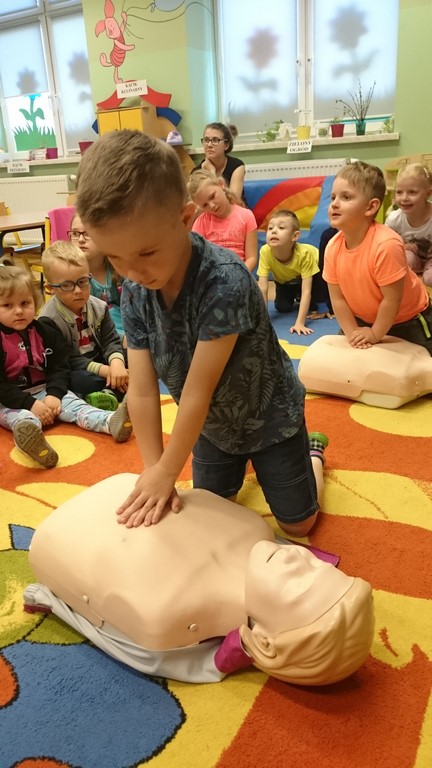 W piątek grupa uczniów uczęszczających na zajęcia z Bezpieczeństwa Ruchu Drogowego: Natalia, Bartosz, Szymon i Patryk, udała się do przedszkola w Kobyli by średniakom i starszakom zaprezentować podstawowe zasady udzielania pierwszej pomocy przedmedycznej. Pokaz obejmował masaż serca, sztuczne oddychanie, układanie w pozycji bocznej- bezpiecznej oraz zakładanie chusty trójkątnej. Od teorii przeszliśmy do praktyki, z którą przedszkolaki poradziły sobie bardzo dobrze. Na koniec przypomnieliśmy numery alarmowe i zwróciliśmy uwagę na zachowanie bezpieczeństwa na drodze i w przedszkolu.