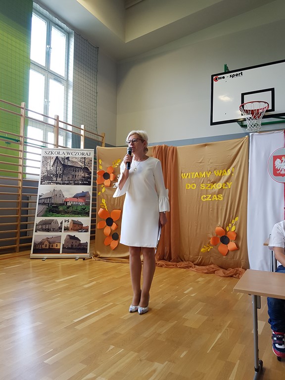 Po odśpiewaniu hymnu narodowego i szkolnego, pani dyrektor Joanna Kolarczyk przywitała wszystkich po dwumiesięcznej wakacyjnej przerwie. W uroczystości rozpoczynającej rok szkolny wzięli udział zaproszeni goście, przewodniczący Komisji Oświaty pan Jan Zaczyk oraz funkcjonariusze Komendy Powiatowej Policji w Raciborzu.