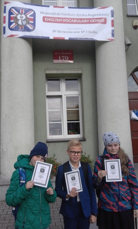 W piątek, 26 października, troje piątoklasistów: Paulina Scheithauer, Fabian Dąbrowski i Szymon Rybiński, wzięli udział w Wojewódzkim Konkursie Języka Angielskiego English Vocabulary Genius V, organizowanym przez Szkołę Podstawową im. Ziemi Radlińskiej. Zadaniem uczestników było napisanie 200 wybranych przez organizatora słówek w ciągu 40 minut, spośród 250, które otrzymali do nauki. A słówka wcale nie były łatwe i nasi uczniowie poświęcili niemalo czasu, by je opanować. Teraz nie pozostało nic innego jak czekać na wyniki. Bez względu na końcowy efekt, piątoklasistom serdecznie gratulujemy chęci i odwagi, że podjęli się tego zadania!