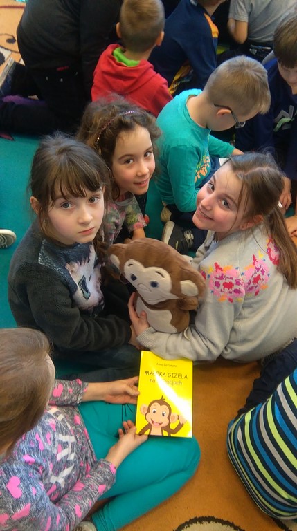 Punktem kulminacyjnym akcji było spotkanie z autorką książeczek dla dzieci, Panią Anną Gotzmann oraz głównym bohaterem jej bajek – małpką Gizelą. Pani Gotzmann opowiedziała dzieciom o pomyśle powstania książki, przybliżyła główne postacie w niej występujące oraz przeczytała fragment opisujący jedną z przygód małpki Gizeli. Pisarka podarowała także szkole zestaw swoich książeczek, które będzie można wypożyczyć w naszej bibliotece.