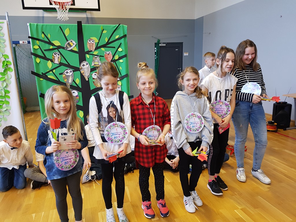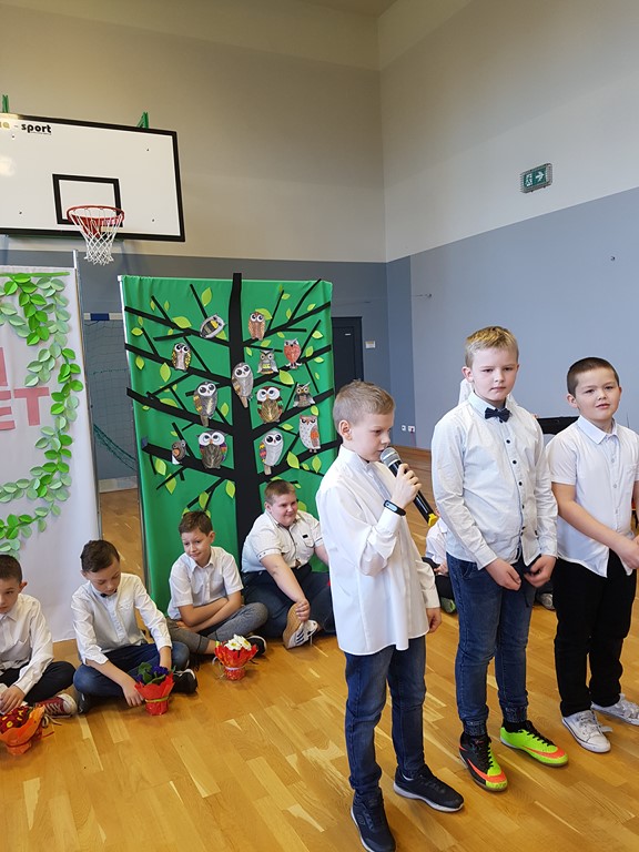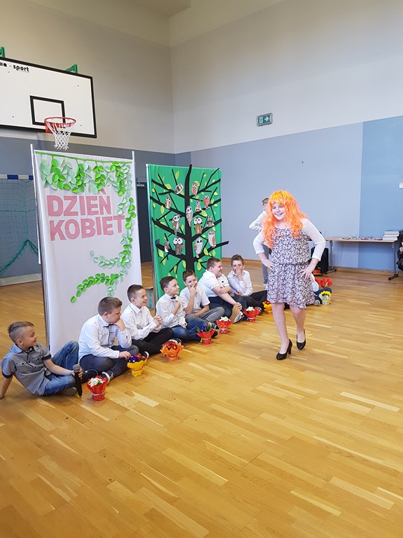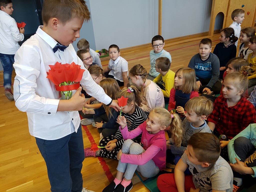 8 marca świętowaliśmy w szkole Dzień Kobiet. Z tej okazji chłopcy, w tajemnicy przed dzieczynkami, przygotowali uroczysty poranek. Podczas występu złożyli paniom i koleżankom życzenia, przedstawili najnowsze trendy w modzie kobiecej na a przede wszystkim, wyrazili za co tak naprawdę szanują i kochają płeć piękną. Podczas występu przygrywał na organach Szymon z klasy IV. Chłopcy wręczyli paniom kwiaty a dziewczynkom tulipany wykonane przez uczniów klasy VI. Na koniec podali wyniki rankingu, jaki przeprowadzili kilka dni wcześniej i wręczyli medale oraz upominki dla NAJSYMPATYCZNIEJSZYCH DZIEWCZYNEK W SZKOLE.