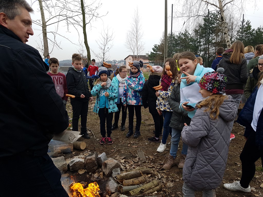 21 marca, trqadycyjnie powitaliśmy wiosnę. Z tej okazji odwiedzili nas mysliwi z koła łowieckiego "Borek", którzy opowiedzieli o swojej pracy oraz przedstawili zwyczaje zwierząt mieszkających w najliższej okolicy. Pó,źniej udaliśmy się na wiosenny spacer zakończony meczem chłopców z klas IV i V kontra kl. VI. Na koniec piekliśmy kiełbasy i grzaliśmy się przy ognisku.