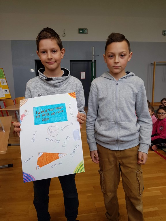 Marzec zakończyliśmy świętowaniem Dnia Matematyki. Uczniowie całej szkoły mogli aktywnie włączyć się w różnorodne działania. Klasy I - III uczestniczyły w konkursie na Mistrza Matematyki. W klasie I zwyciężył Kacper Staniczek, w klasie II Michał Porębski, a w klasie III Hanna Scheithauer. Uczniowie klas IV - VI uczestniczyli w lekcjach matematyki opartych na scenariuszu pochodzącego ze strony organizatora - 4improve. Każda klasa uczestniczyła w klasowym turnieju matematycznym. Tematem w tym roku była "Matematyka dzika" - zadania turniejowe były związane z przyrodą i matematyką. W piątek na 3 lekcji odbył się również turniej międzyklasowy dla klas IV - VI. Uczniowie zmierzyli się w pięciu konkurencjach: "Plakat matematyczny", "Mistrz tabliczki mnożenia", "Ludolfina", "Zagadki i rebusy" oraz "Moda matematyczna". W turnieju zwyciężyła klasa V, drugie miejsce zajęła klasa IV, miejsce klasa VI. Ostatnią aktywnością w jakiej mogli uczestniczyć uczniowie naszej szkoły był konkurs "Jak sfotografować matematykę?". Polegał on na zrobieniu zdjęcia bardzo ogólnie związanego z matematyką. Zwycięzcy konkursu: