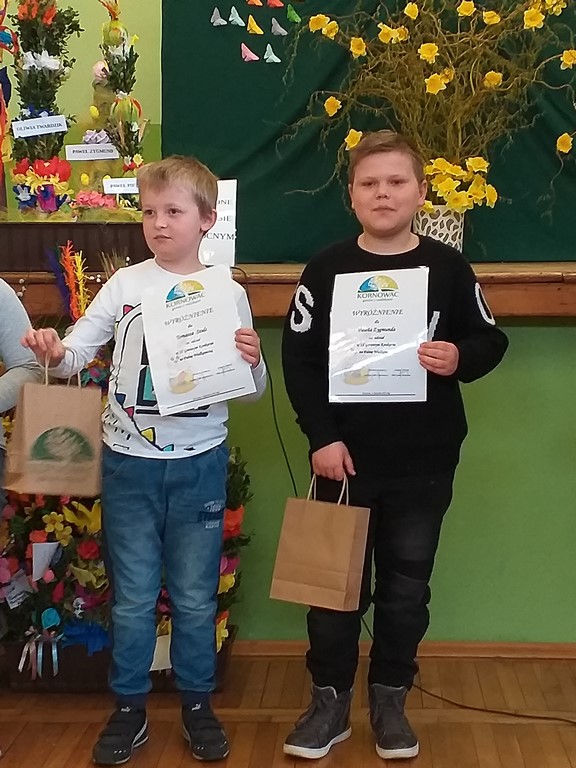 W marcu, uczniowie naszej szkoły wzięli udział w Gminnym Konkursie na Palmę Wielkanocną. Spośród wszystkich uczniów szkół podstawowych naszej gminy, którzy wzięl udział w konkursie nasi uczniowie zdobyli dwa wyróżnienia: w katgorii klas I-III - wyróżnienie otrzymał Tomasz Szulc z klasy I, w kategorui klasa IV-Vi - wyróżnienie otrzymał Paweł Zygmund z klasy IV. Chłopaki, gratulujemy pomysłu i trzymamy kciuki za dalsze sukcesy.