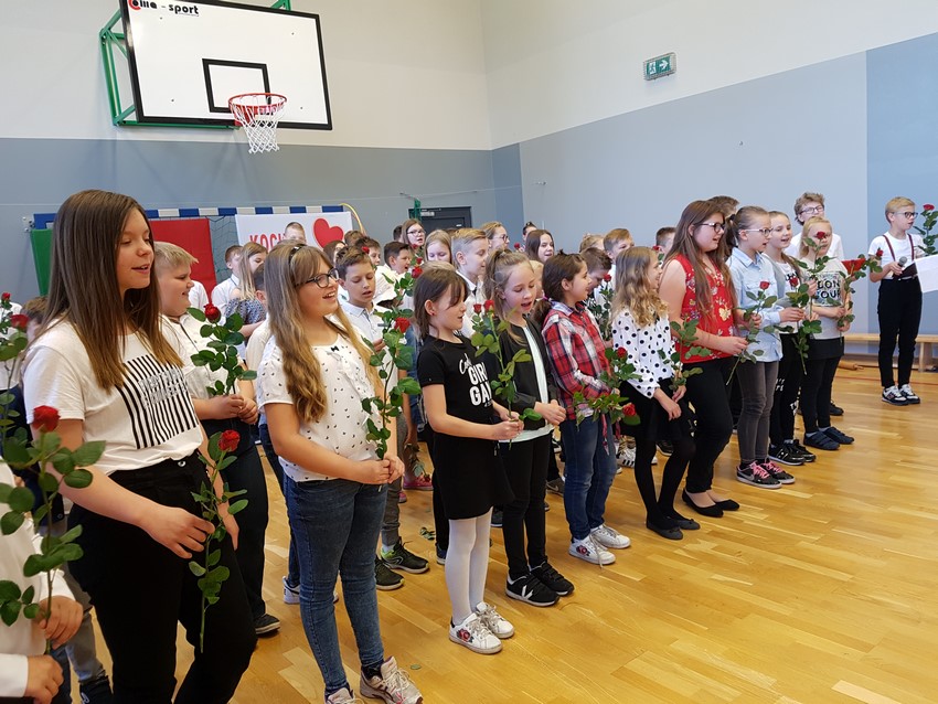 W piąątek, z okazji Dnia Matki, ucziowie klass IV-VI przygotowali dla swoich mam niespodziankę. Nie był to typowy występ z wierszykami i piosenkami, ale wspólne sspotkanie i zabawy integracyjne, w których mamy brały udział wspólnie z swoimi pociechami. Było dużo śmiechu i dobrej zabawy. Uczniowie złożyli również mamom życzenia i wręczyli róże.