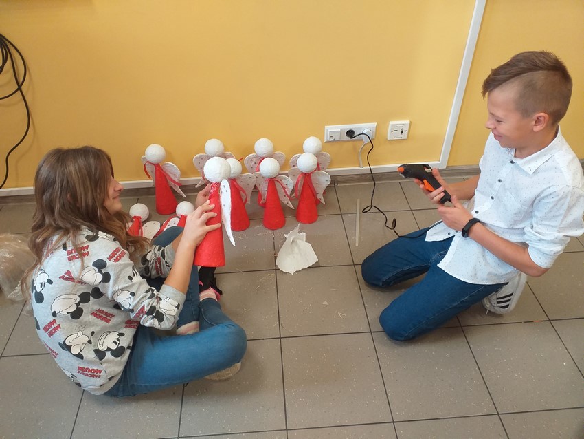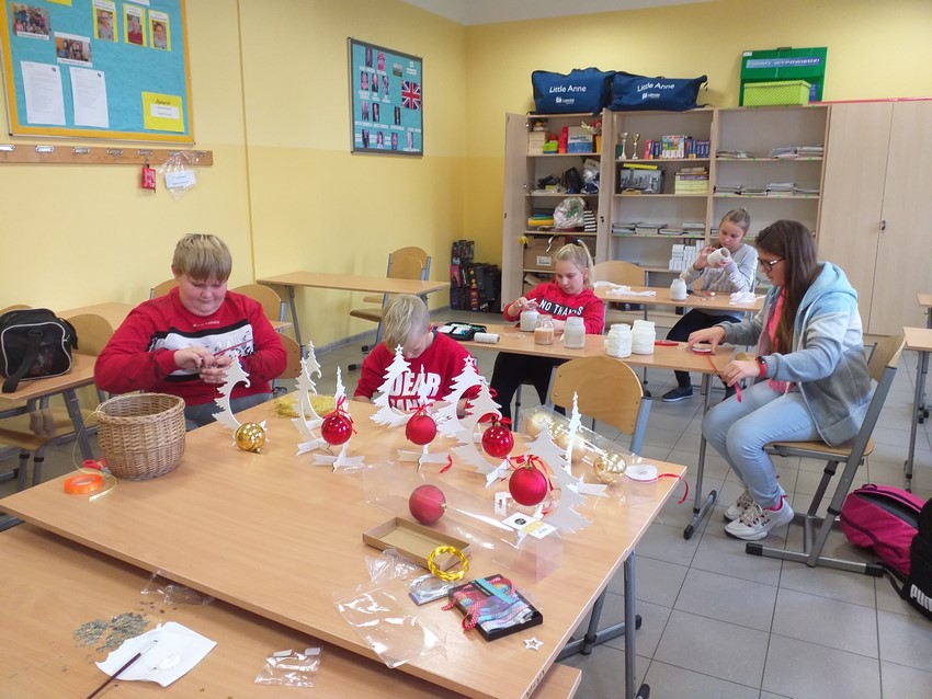 Uczniowie klasy V angażują się w organizację Kieermaszu Świątecznego. Kiermasz, organizowany przez Gminę Kornowac przypada w tym roku na 15 grudnia, ale już w ubiegłym tygodniu uczniowie klasy V przygotowali świąteczne ozdoby. Są to aniołki, świeczki i ozdobne choinki z bombkami.