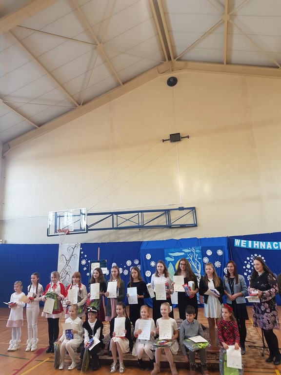 Uczniom naszej szkoły udało się osiągnąć bardzo dobre wyniki! Julia Kribus zaśpiewała pastorałkę „Engel auf den Feldern singen” i zajął III miejsce w kategorii klas IV-VI. Natomiast Piotr Gawron, który zaprezentował kolędę „Leise rieselt der Schnee” zajął wyróżnienie w kategorii klas IV-VI.