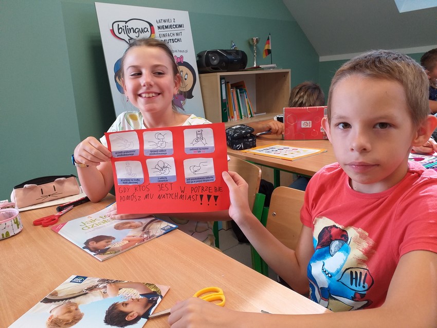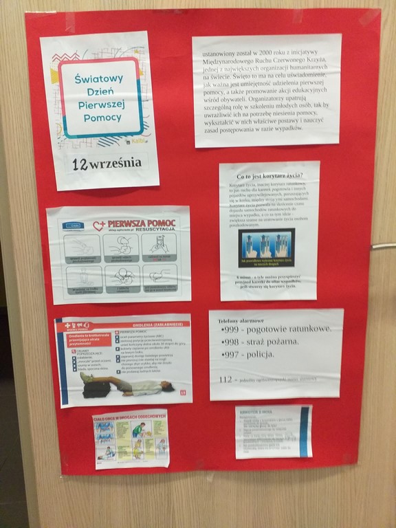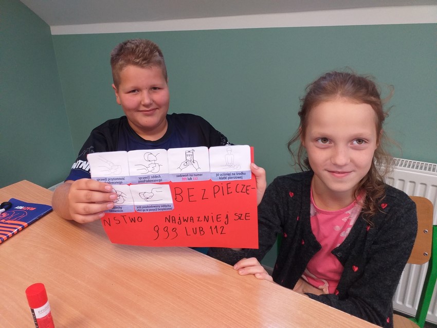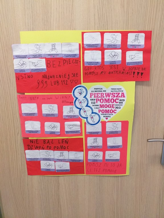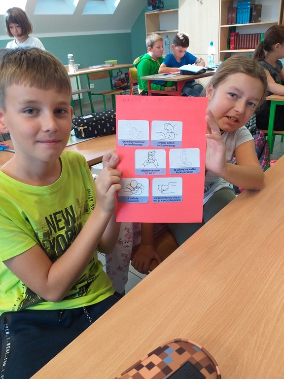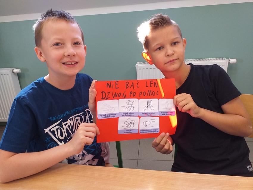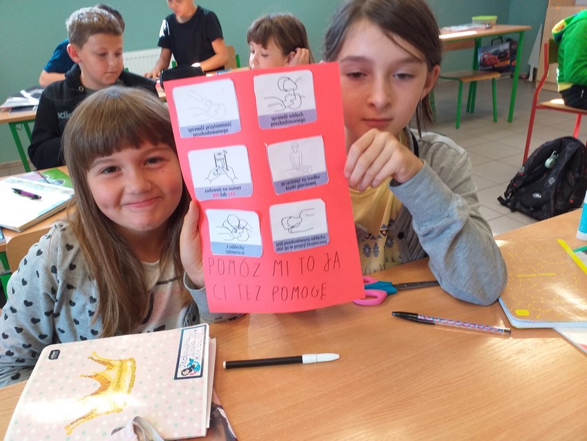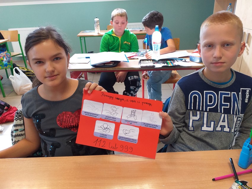 W drugą sobotę września obchodzimy Międzynarodowy Dzień Udzielania Pierwszej Pomocy. W tym roku nie ćwiczyliśmy praktycznej nauki resuscytacji krążeniowo-oddechowej, ale przypomnieliśmy sobie zasady wzywania pomocy, dzwonienia na pogotowie, poznaliśmy też na czym polega "łańcuch przeżycia". Dodatkowo klasa IV przygotowała plakaty z hasłami zachęcającymi do udzielania pomocy, które zawisły na drzwiach szatni, tak by każdy mógł przeczytać i utrwalić zasady bezpiecznej i skutecznej resuscytacji krążeniowo-oddechowej.