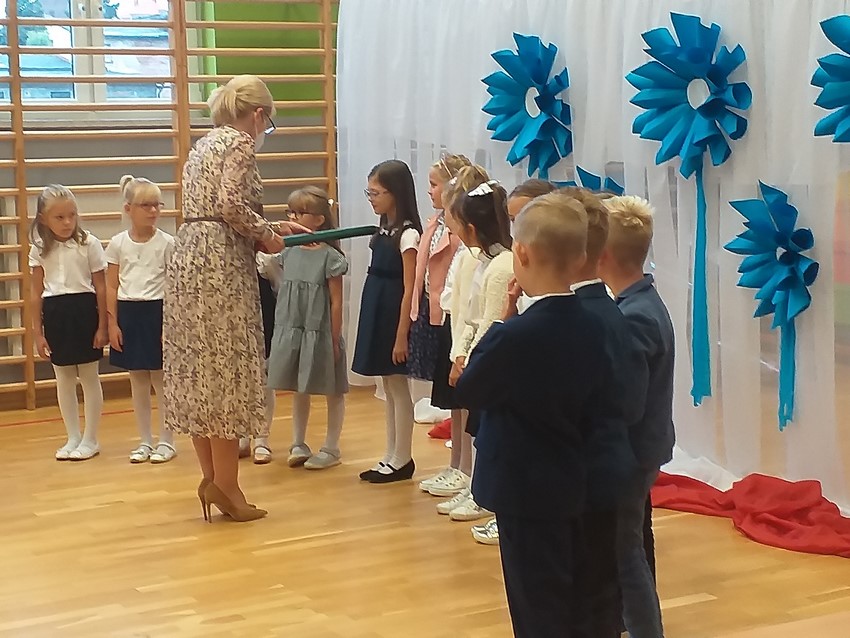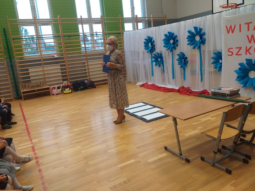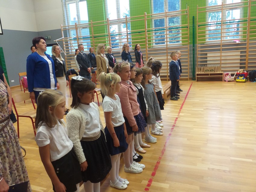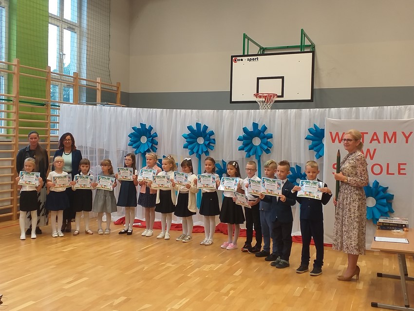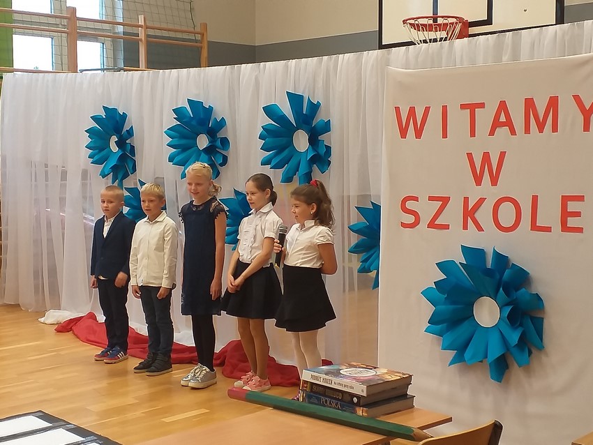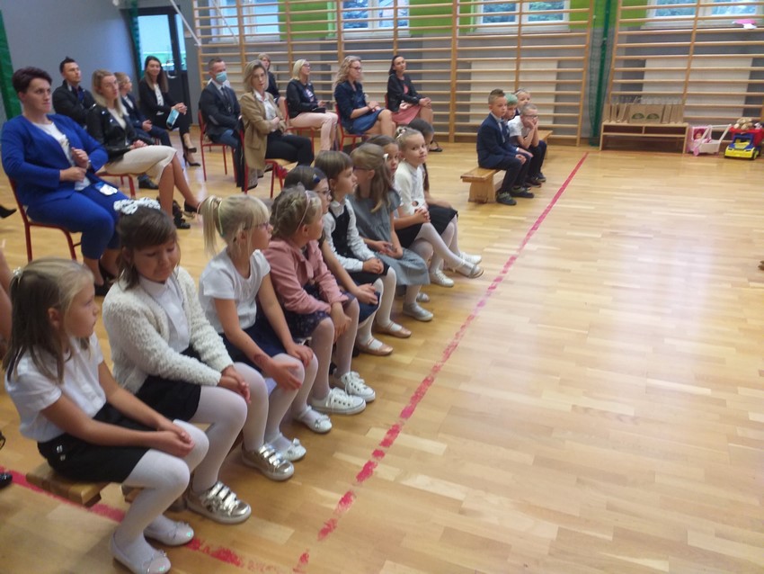 Uczniów starszych klas przywitali wychowawcy w swoich nowych salach lekcyjnych. A pierwszacy wraz z rodzicami spotkali się z wychowawcą oraz z panią dyrektor na sali gimnastycznej. Był to dla naszych nowych uczniów dzień szczególny, gdyż pierwszy raz złożyli ślubowanie i oficjalnie wszyscy zostali włączeni do braci uczniowskiej. Przedstawiciele klasy drugiej powitali nowych kolegów wierszem, piosenką oraz upominkiem. Po tej uroczystości każdy z wielkim rogiem obfitości dziarsko pomaszerował do swojej klasy, aby zasiąść w ławce szkolnej.
