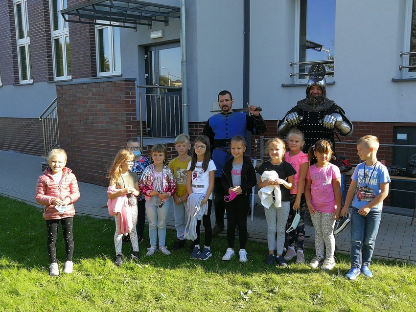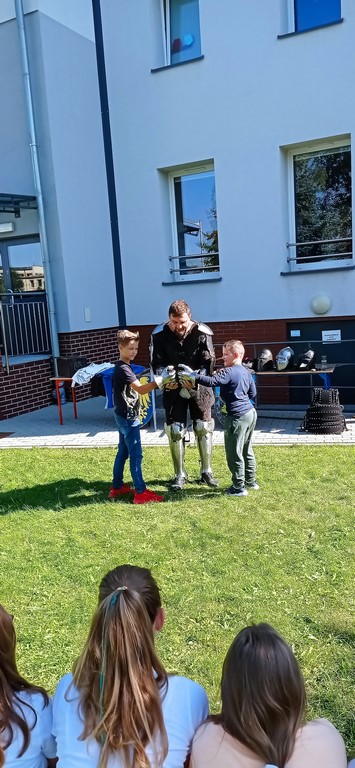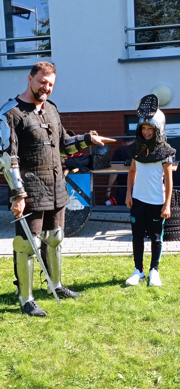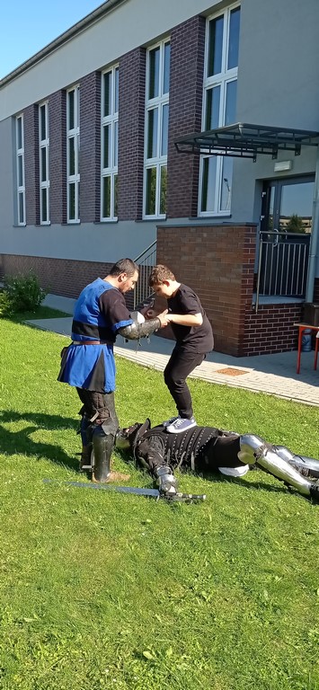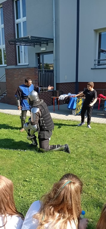 Ostre miecze, ciężkie zbroje, topory, hełmy i przede wszystkim ciekawe historie przedstawili w naszej szkole członkowie Bractwa Rycerskiego z Zamku w Ogrodzieńcu przebrani za rycerzy. 9 września rycerze w sposób ciekawy, humorystyczny prezentowali sprzęt rycerski, ubiór rycerzy, a także kobiet żyjących w tamtych czasach. Nasi uczniowie mogli się przekonać jak ciężki hełm, miecz, tarczę czy rękawice nosił rycerz. Finałem rycerskiego pokazu była efektowna walka na miecze rycerzy ubranych w pełnej zbroi. Wydarzenie mogło się odbyć dzięki Gminnemu Ośrodkowi Kultury w Kobyli za co zarówno uczniowie jak i nauczyciele naszej szkoły są bardzo wdzięczni.
