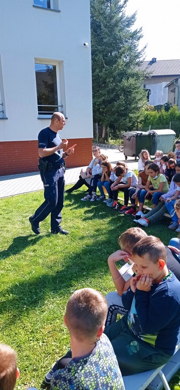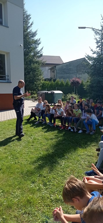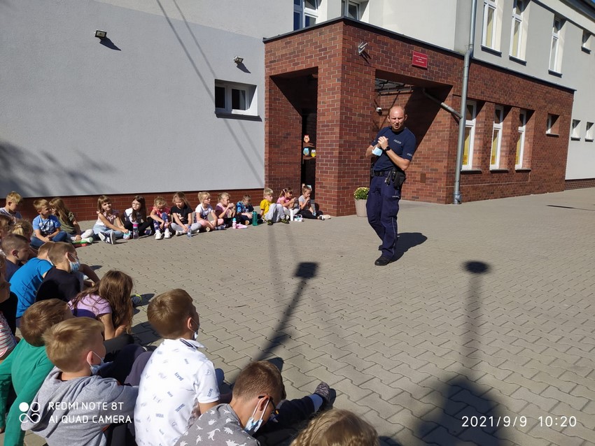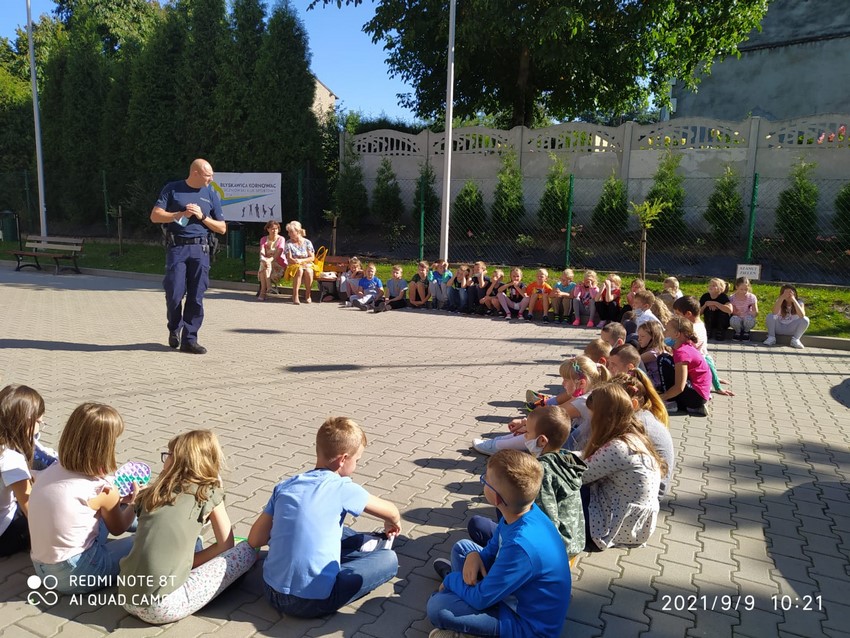 W naszej szkole duży nacisk kładziemy na bezpieczeństwo oraz edukację związaną z bezpieczeństwem dzieci. Na początku każdego roku szkolnego przypominamy znaki drogowe i zasady poruszania się po drogach. W związku z tym 10 września uczniowie spotkali się z panem dzielnicowym pracującym na terenie naszej gminy. Tematem spotkania było przede wszystkim bezpieczeństwo. Policjant rozmawiał z dziećmi o bezpiecznym poruszaniu się po ulicach, a w szczególności omówił zasady bezpiecznej drogi do i ze szkoły,. Przypomniał również o korzyściach noszenia elementów odblaskowych przy ubraniu bądź tornistrze oraz jak należy zachować się, gdy zaczepi nas obca osoba. Pan policjant uczulił także uczniów, aby zawsze pamiętali o zapinaniu pasów podczas podróży samochodem. Dzieci odpowiadały na zadawane pytania, wykazały się wiedzą z zakresu bezpieczeństwa w ruchu drogowym. Spotkanie było interesujące i pouczające, a przekazana wiedza teoretyczna z pewnością znajdzie zastosowanie w praktyce.