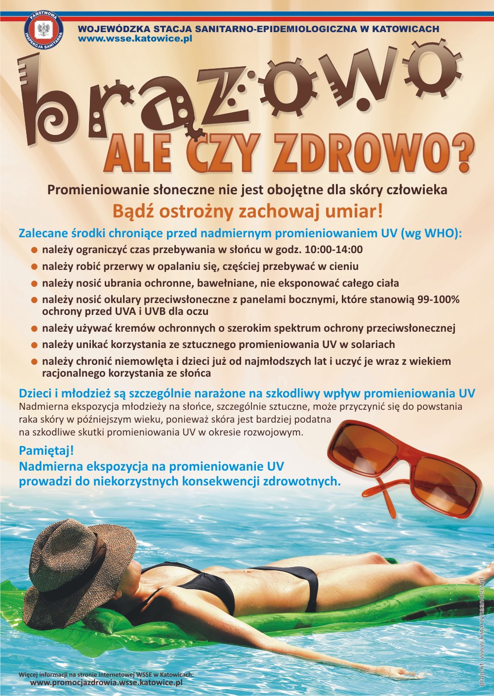 Powiatowa Inspekcja Sanitoarno-Epidemiologiczna w Raciborzu realizuje akcję "Bezpieczne Wakacje 2022" oraz :Brązowo, ale czy zdrowo". Celem akcji, które potrwają od 24.06.2022 r. - 1.09.2022 r. jest stworzenie wakacji bezpiecznych wakacji bezpiecznych dla dzieci i młodzieży na terenie powiatu raciborskiego, zwłaszcza w ośrodkach wypoczynku letniego. mPrzestrzeganie zasad może pozwolić na uniknięcie wielu niebezpieczeństw i zagrożeń zdrowotnych.