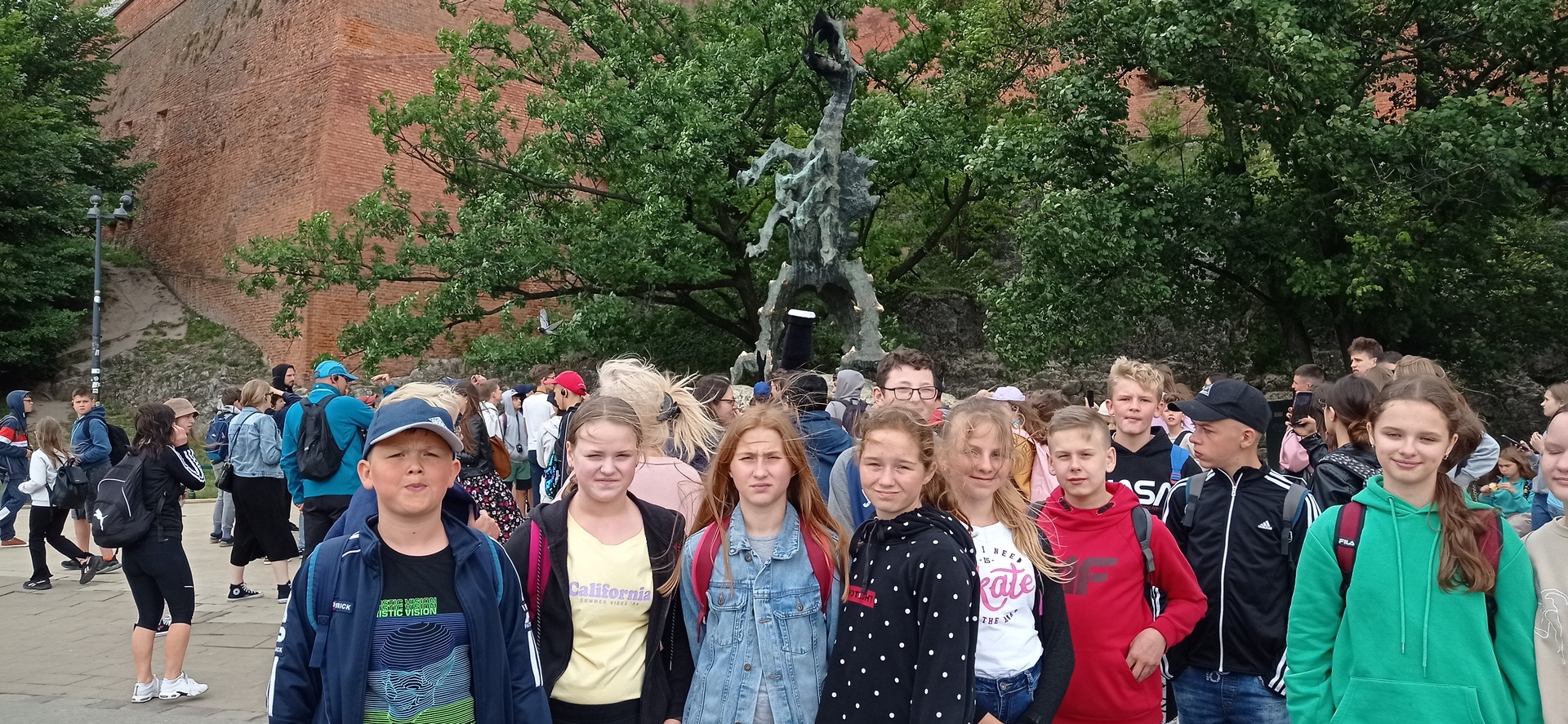W ostatnim tygodniu roku szkolnego klasa 6 wybrała się pociągiem na dwudniową wycieczkę do Krakowa. Już przygodą była podróż pociągiem - dla niektórych pierwszy raz w życiu. W pierwszym dniu po wysłuchaniu Hejnału i zwiedzeniu kościoła Mariackiego ruszyliśmy zwiedzać Wawel: zamek, katedrę, dwie wystawy muzealne "Wawel zaginiony" i "Wawel odzyskany". Odwiedziliśmy także Smoka Wawelskiego, który na naszą prośbę zionął ogniem :) Następnie kolejne wyzwanie tego dnia - wyprawa tramwajem do Ogrodu Doświadczeń. Spędziliśmy tam przeszło trzy godzin poznając poprzez zabawę zasady fizyki, optyki, chemii i ogólnie nauk przyrodniczych. W drugim dniu wycieczki zaraz po śniadaniu ruszyliśmy do "Labiryntu Luster", gdzie w "Pokoju Nieskończoności" i na wirtualnym rollercoasterze daliśmy się nabierać na różne optyczne złudzenia dobrze się przy tym bawiąc. Żeby zachować równowagę ruszyliśmy do Muzeum Podziemi Rynku, gdzie przez prawie dwie godziny pani przewodnik w ciekawy sposób opowiadała o tym, co działo się w Krakowie od czasów jego powstania aż do dnia dzisiejszego. Po pysznym obiedzie ruszyliśmy na zwiedzanie dzielnicy żydowskiej "Kazimierz" wracając wzdłuż Wisły do hotelu. Nasza dwudniową przygodę zakończyliśmy w Raciborzu, gdy na peronie dworca PKP czekali już na nas rodzice.