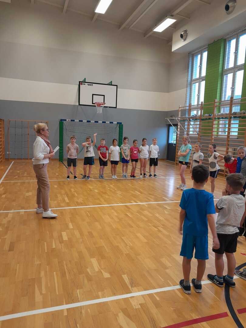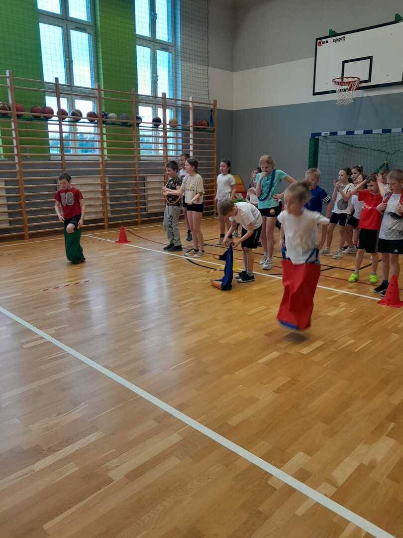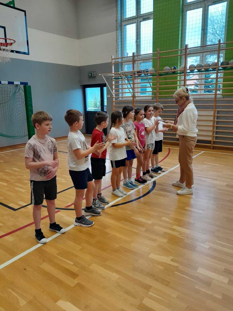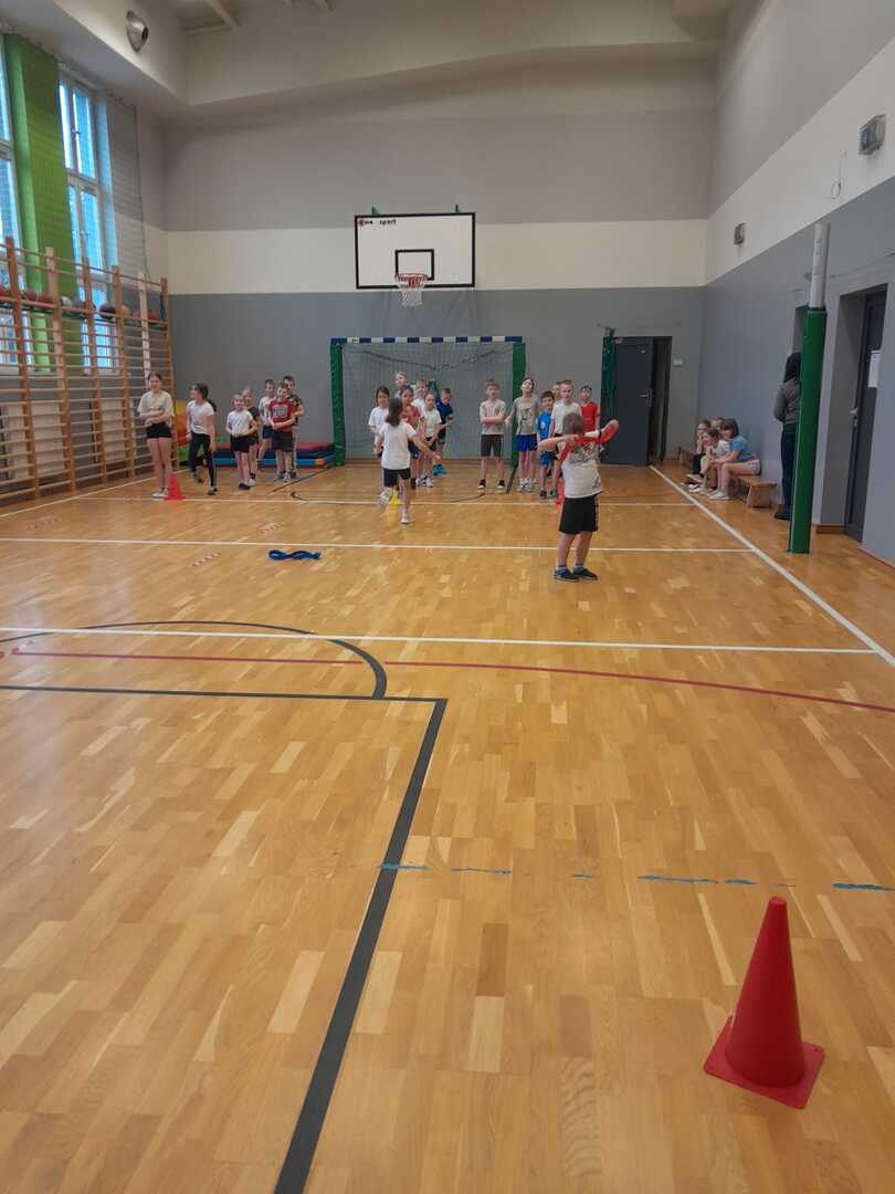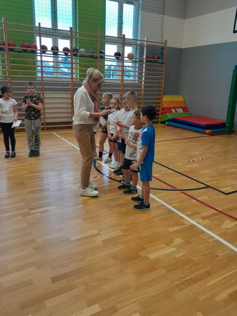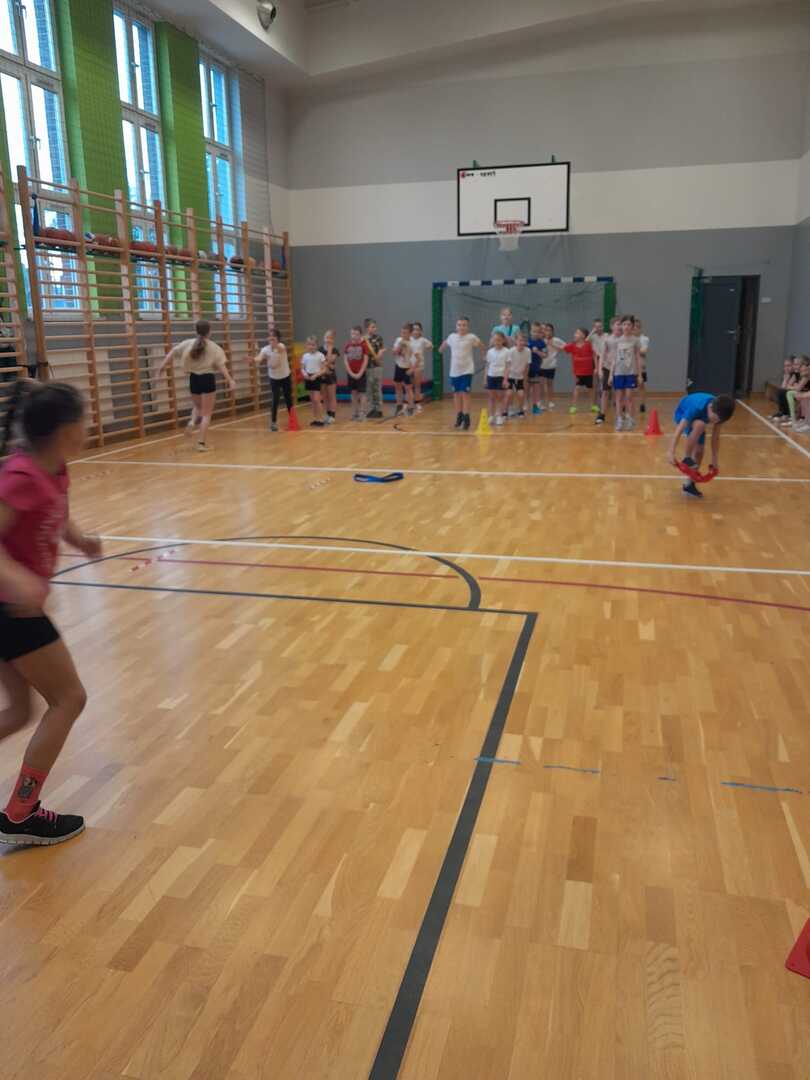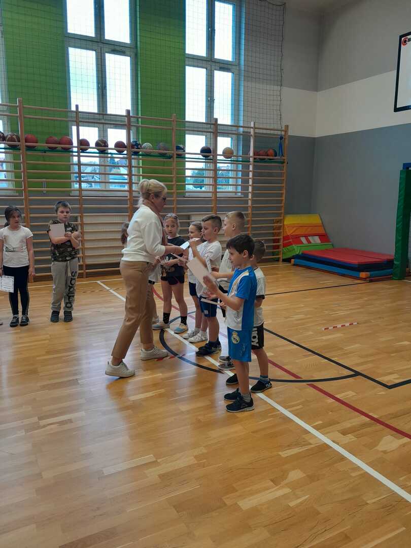 Klasy nie konkurowały ze sobą tylko przydzielono każdego losowo do jednej z trzech drużyn oznaczonych kolorami. Wszyscy świetnie sobie radzili. Rywalizacja była wyrównana. zabawie towarzyszyło dużo emocji i radość z uczestnictwa. W nagrodę za udział w zawodach Pani Dyrektor wręczyła każdemu uczniowi pamiątkowy dyplom.