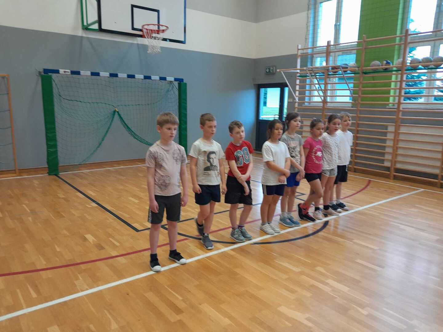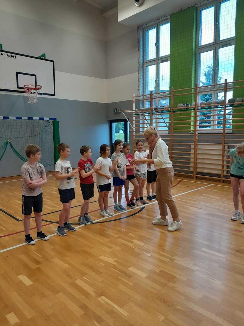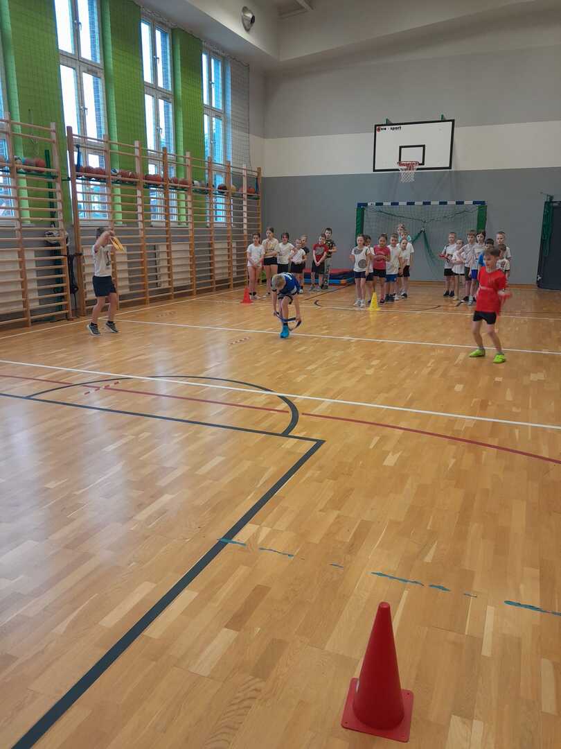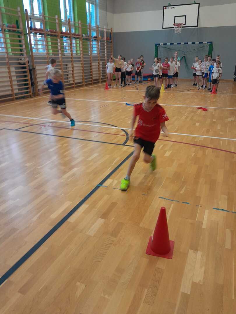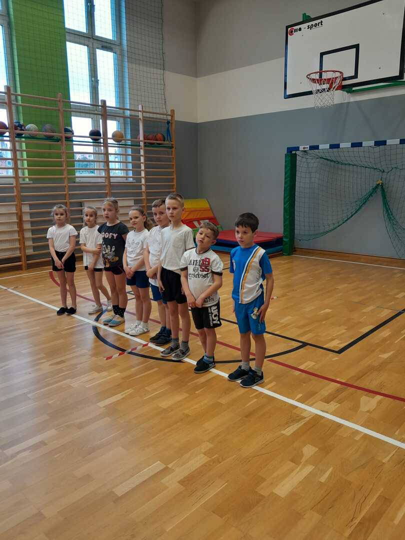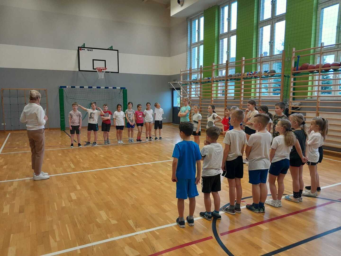 Klasy nie konkurowały ze sobą tylko przydzielono każdego losowo do jednej z trzech drużyn oznaczonych kolorami. Wszyscy świetnie sobie radzili. Rywalizacja była wyrównana. zabawie towarzyszyło dużo emocji i radość z uczestnictwa. W nagrodę za udział w zawodach Pani Dyrektor wręczyła każdemu uczniowi pamiątkowy dyplom.