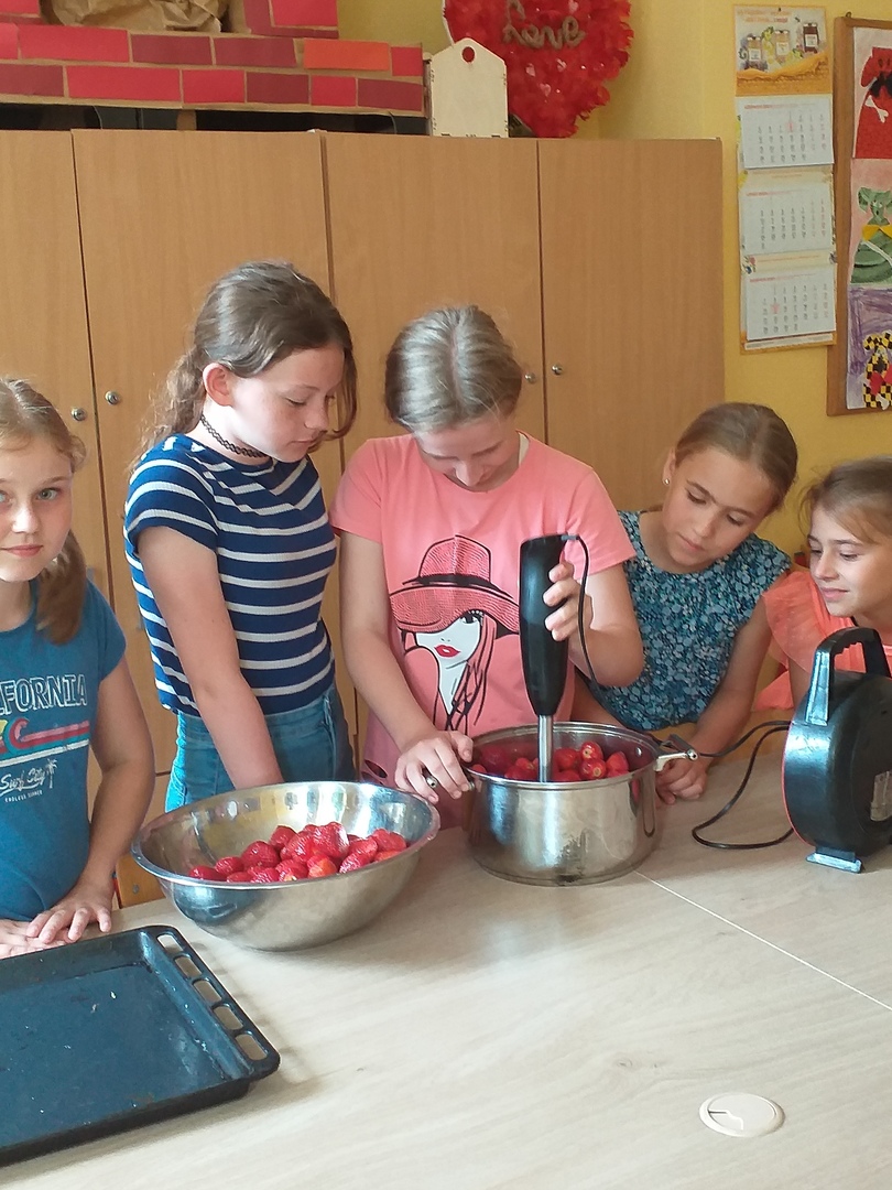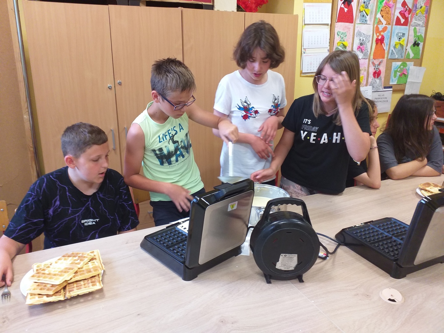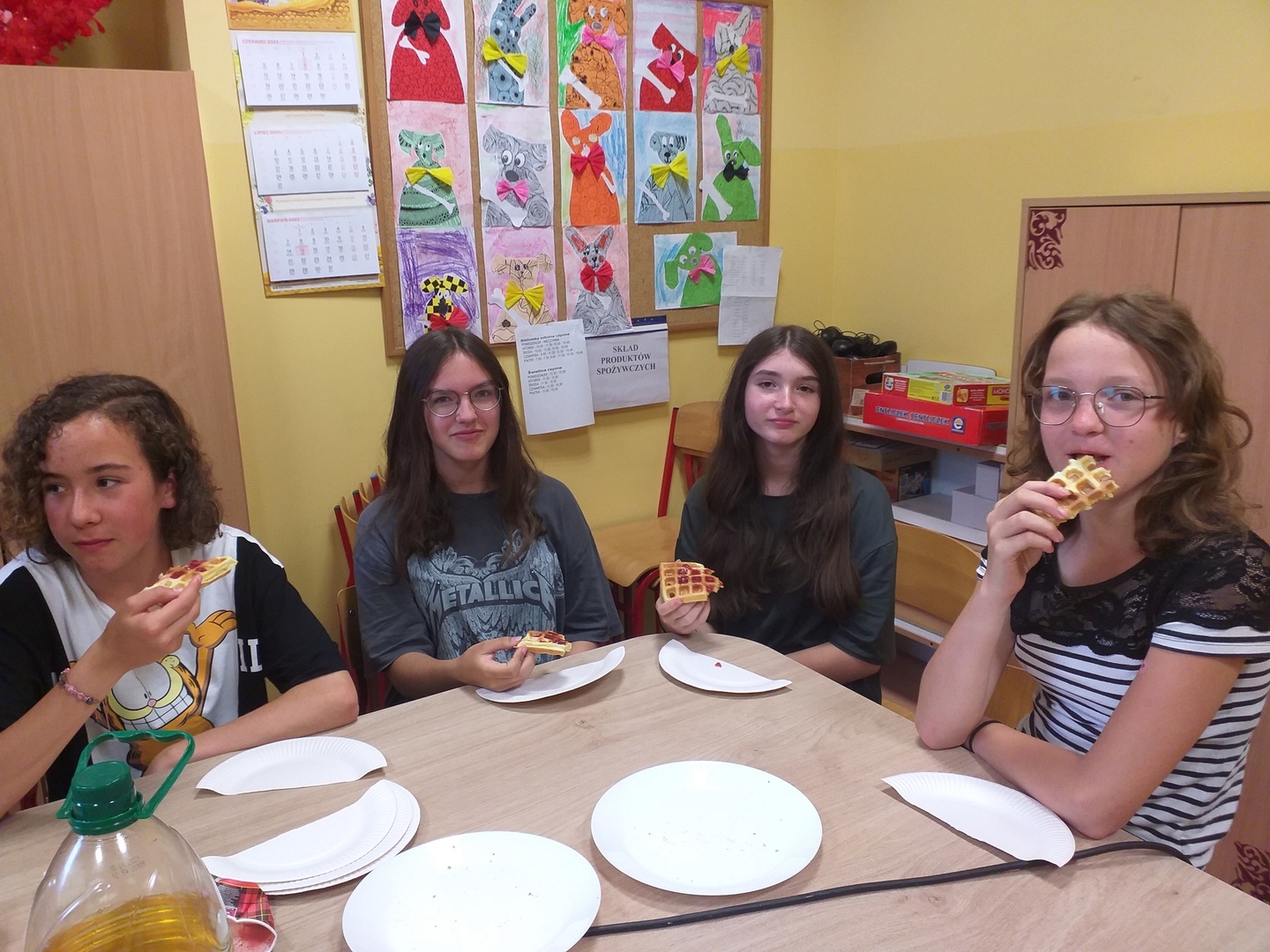 Dobrze wiemy jak ważne w życiu są umiejętności radzenia sobie w różnych sytuacjach. Dzisiaj uczniowie zmierzyli się z gotowaniem, a to za sprawą zajęć pt. "Kuchcikowo", które zorganizowaliśmy w świetlicy szkolnej.Klasa IV przygotowała koktajl truskawkowy, klasa V pizzę, a klasa VI gofry z dżemem. Szkoła wypełniła się wspaniałymi zapachami Dzieci samodzielnie odmierzały składniki , mieszły i piekły a potem częstowały kolegów i koleżanki. Wszyscy stwierdzili jednogłośnie, że samodzielnie przygotowane potrawy smakują o wiele lepiej.