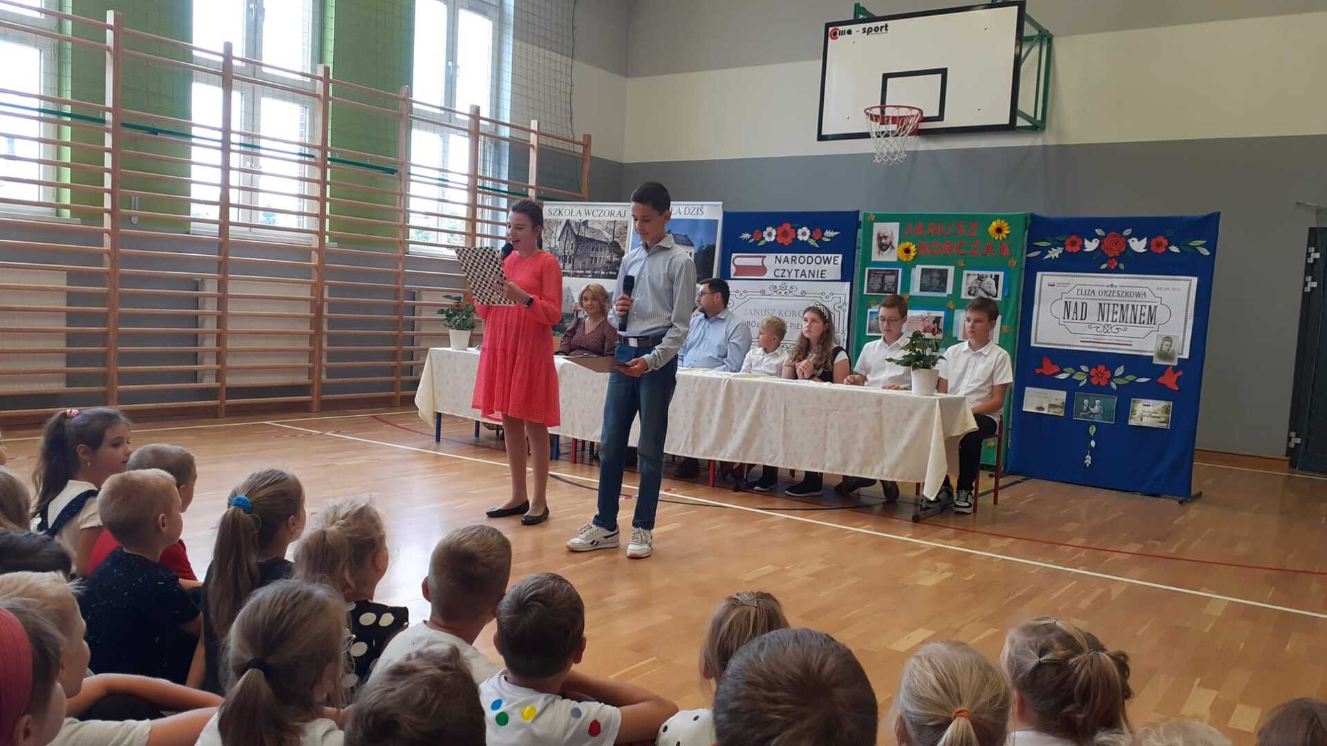 Cały apel poprowadzili uczniowie klasy VII: Julia Klima oraz Ariel Łomnicki. Wszystkim zaangażowanym w szkolną akcję Narodowego Czytania bardzo dziękujemy.