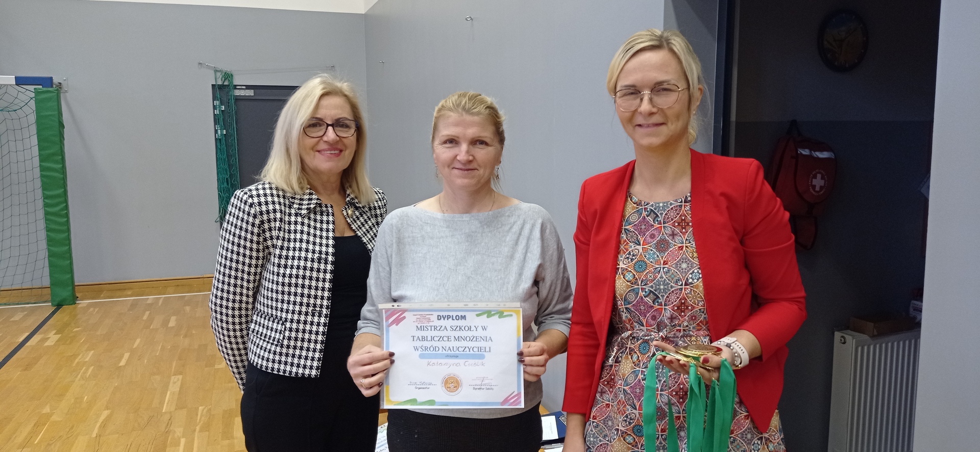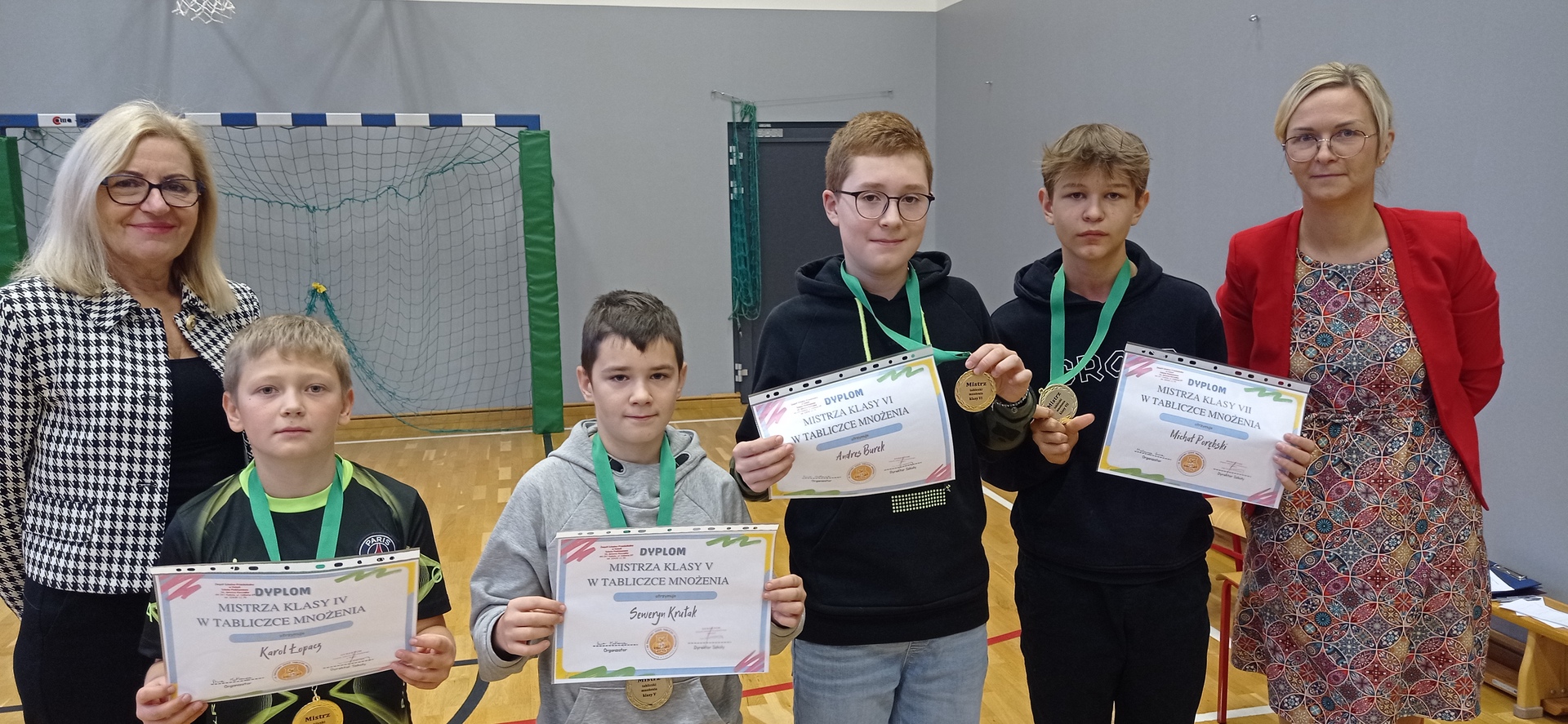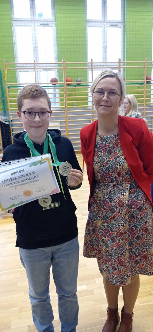 Na sali gimnastyczej spośród klasowych Mistrzów Tabliczki Mnożenia został wyłoniony Mistrz Szkoły - Andres Burek. W zabawie udział wzięli również nauczyciele, którzy także podjęli wyzwanie i rozwiązali test z tabliczki mnożenia. Wśród nauczycieli najszybciej i poprawnie test rozwiązała pani Katarzyna Cieślik. Wszystkim uczestnikom serdecznie gratulujemy i dziękujemy za wspólna zabawę.