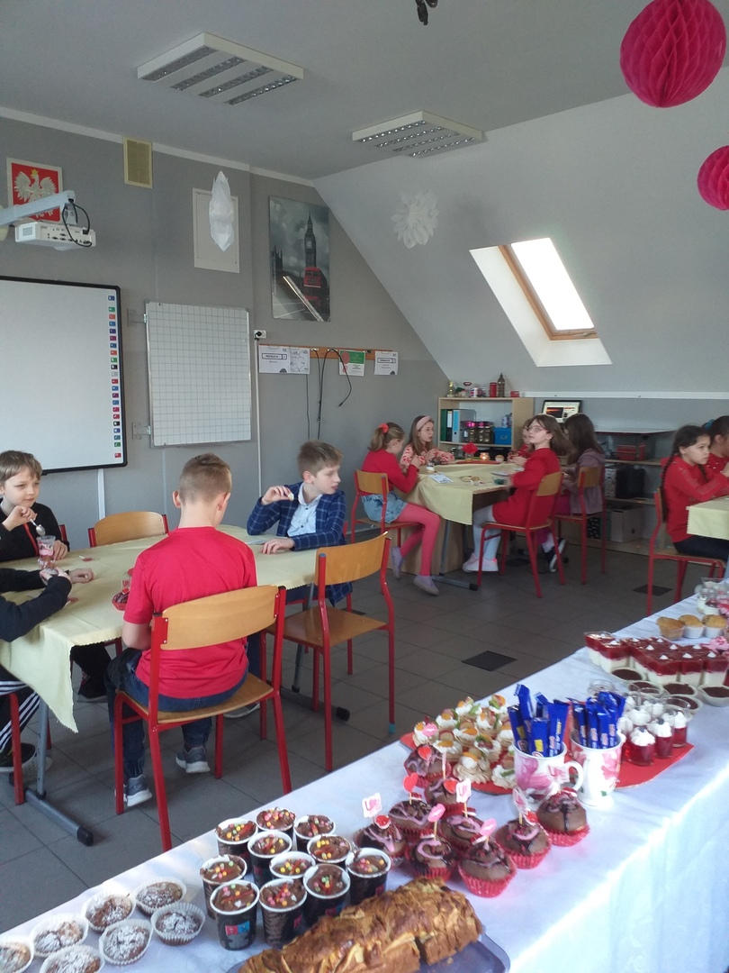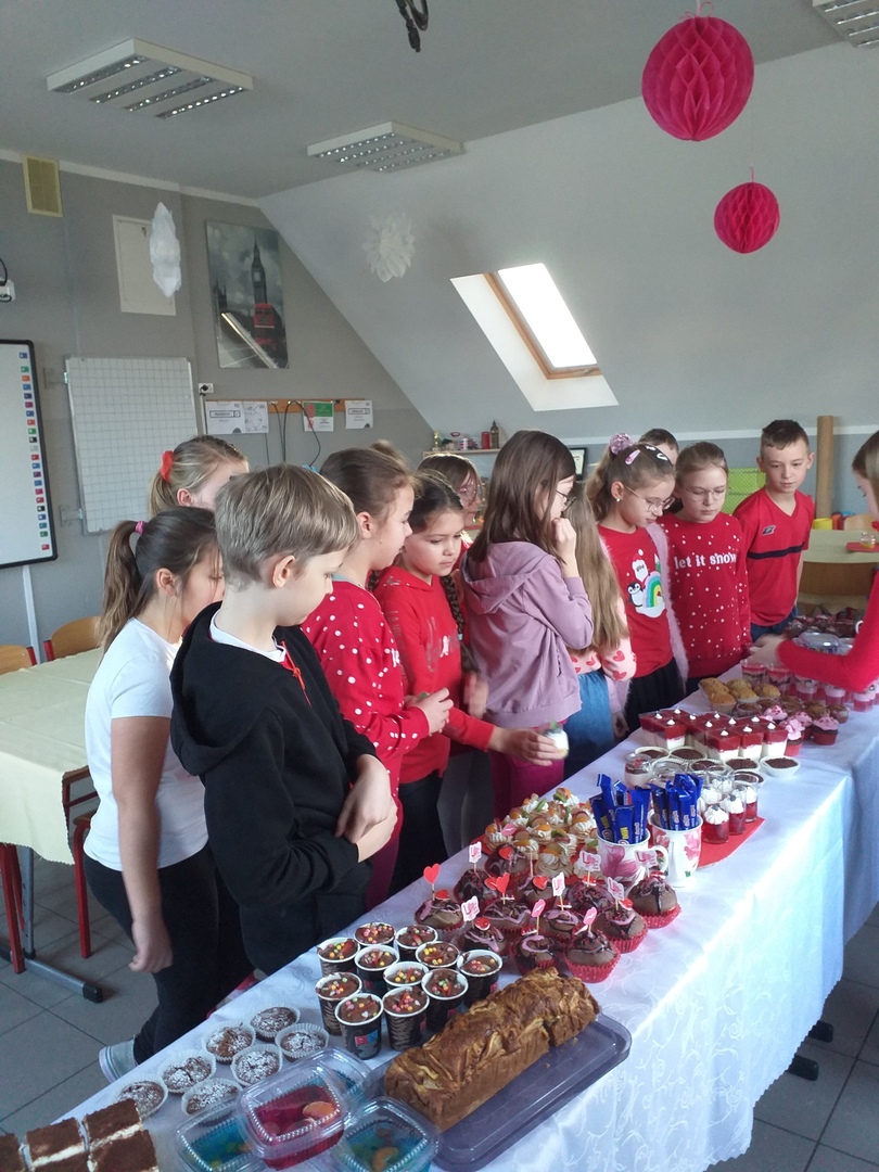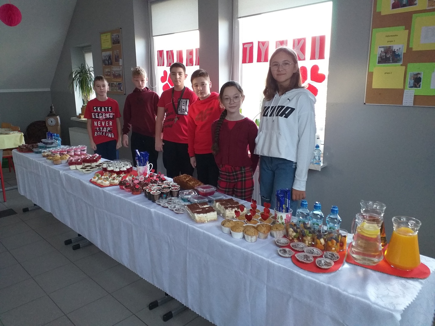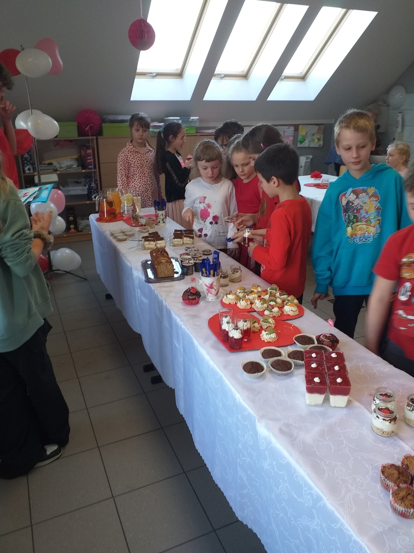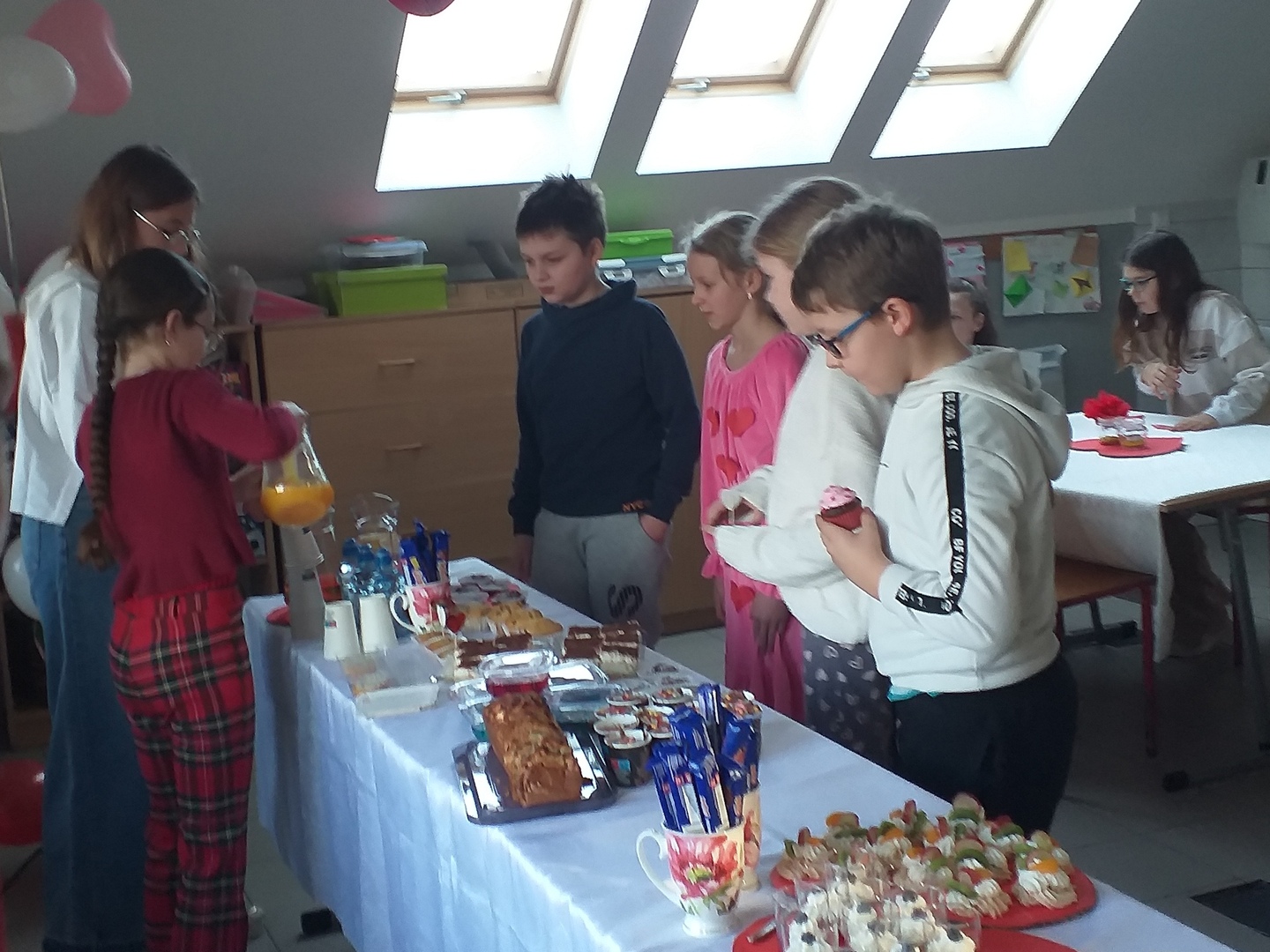 14 lutego w naszej szkole zorganizowano walentynkową kawiarenkę i miłosną pocztę. Słodkie wypieki przy dobrym towarzystwie i ciekawej muzyce, zapewnili nam uczniowie klasy VI wraz z rodzicami. Były galaretki, deserki, babeczki i lizaki, można było również poczęstować się czymś do picia lub sałatką owocową. Kafejka trwała przez prawie cztery lekcje, a gości nie brakowało.