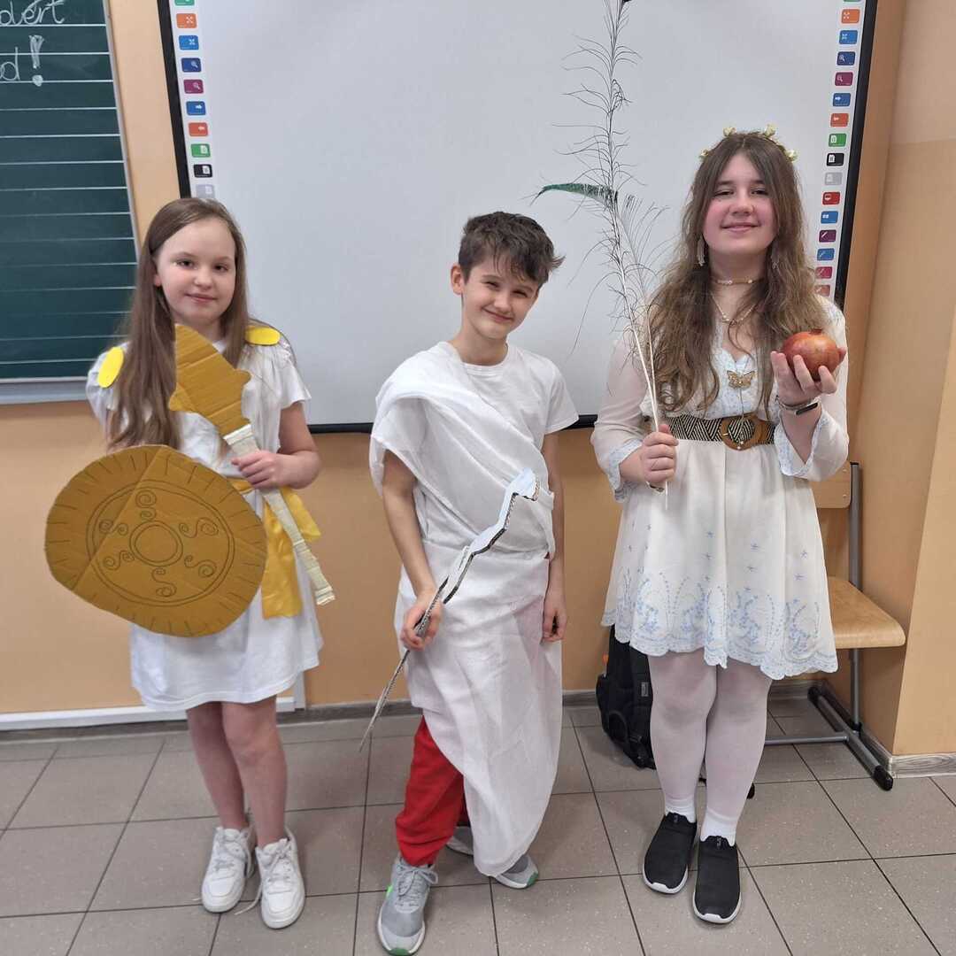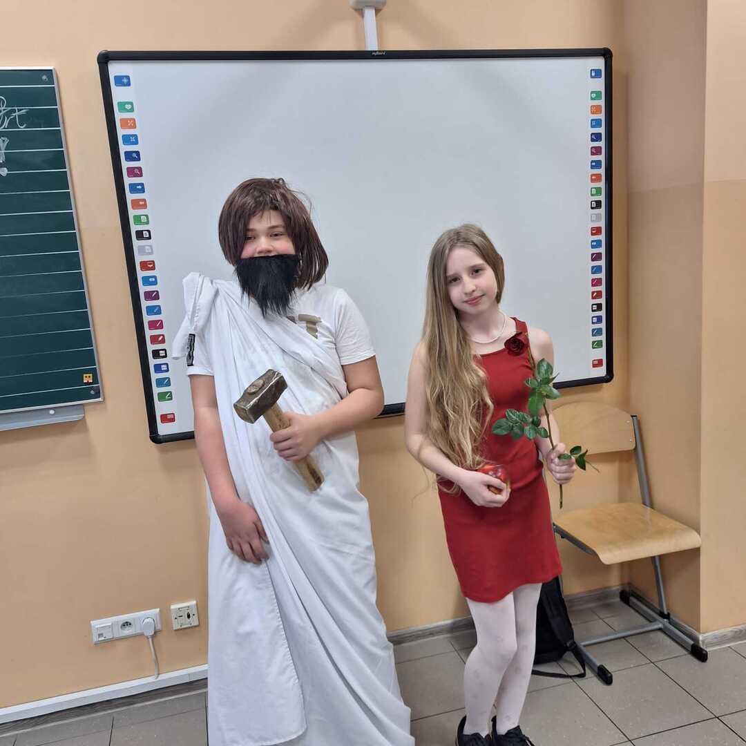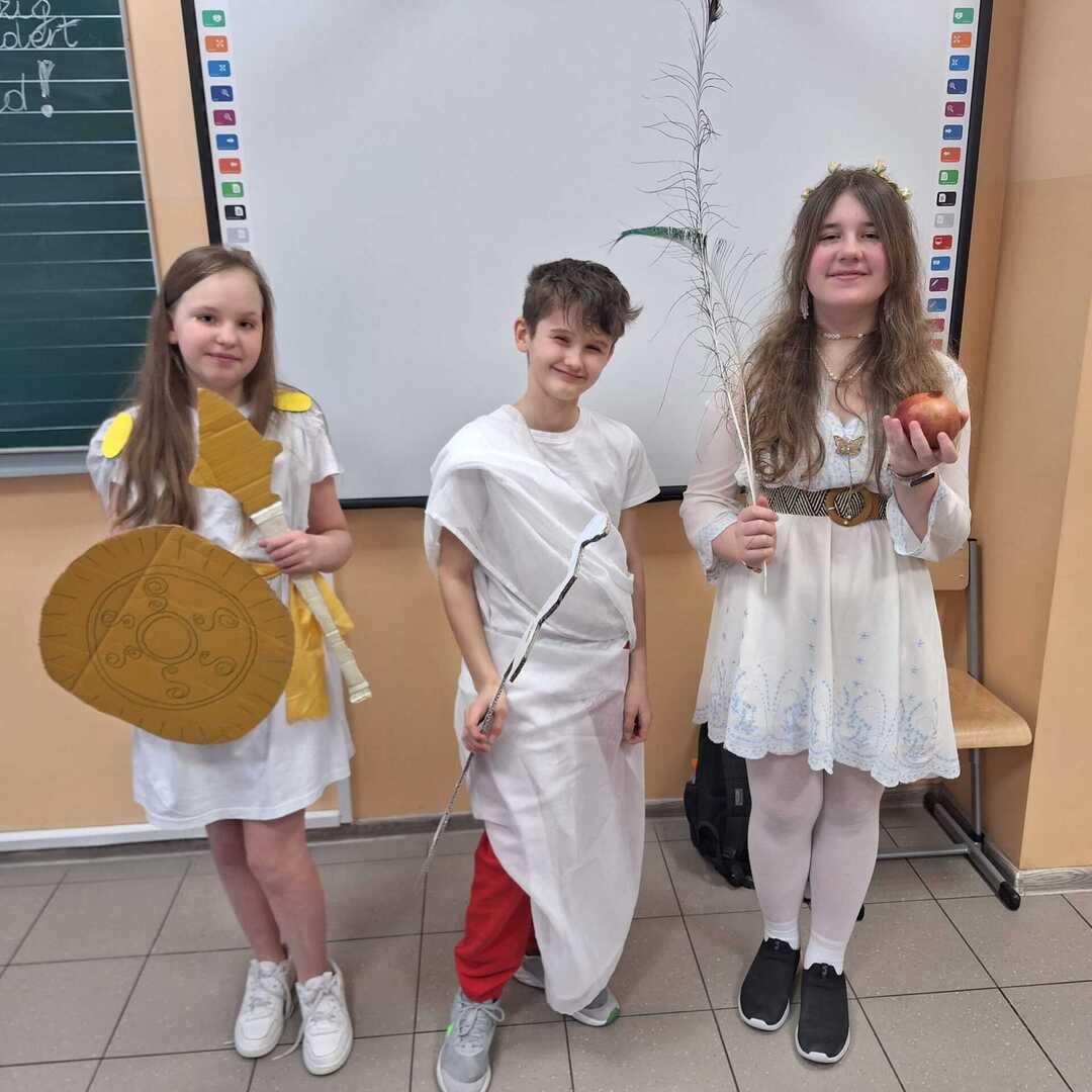 Już po raz drugi, na lekcji języka polskiego, w naszej szkole pojawili się najważniejsi bohaterowie greckich mitów.  W ławkach, w klasie, na korytarzu... Ba! nawet w toalecie można było spotkać, np. uroczą Atenę, silnego Hefajstosa, gromowładnego Zeusa czy mądrą Atenę. Każdy krótko opowiedział o sobie, pokazując jednocześnie swój atrybut - symbolizujący go przedmiot.