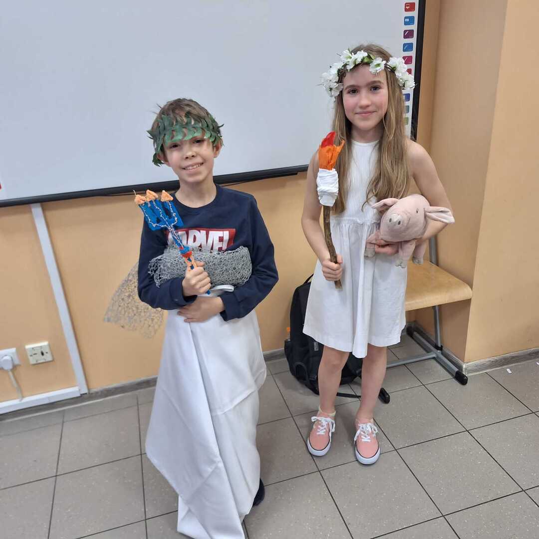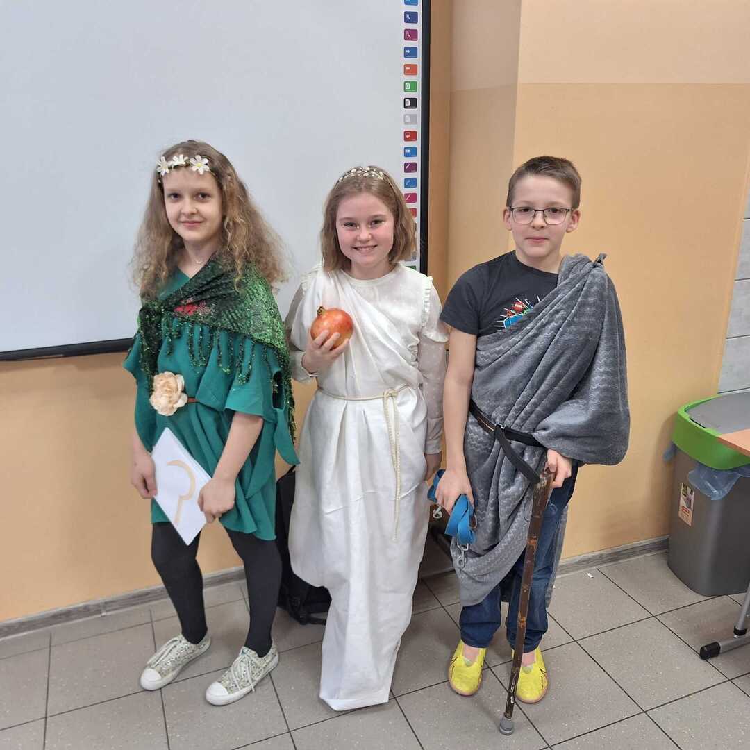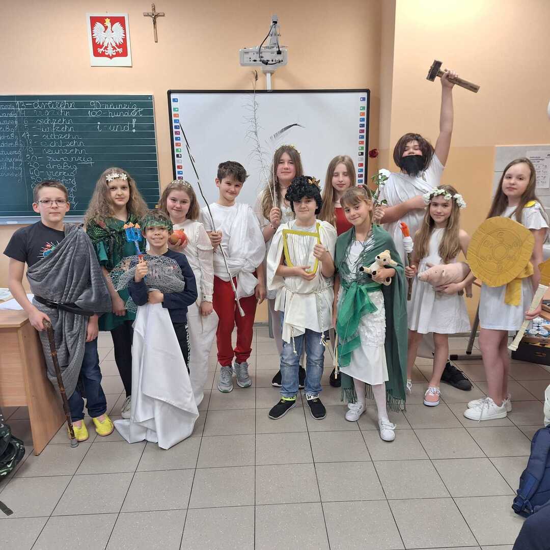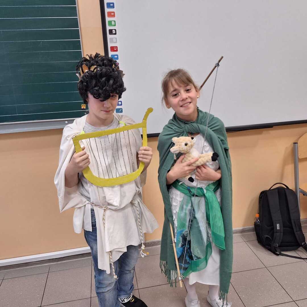 Już po raz drugi, na lekcji języka polskiego, w naszej szkole pojawili się najważniejsi bohaterowie greckich mitów.  W ławkach, w klasie, na korytarzu... Ba! nawet w toalecie można było spotkać, np. uroczą Atenę, silnego Hefajstosa, gromowładnego Zeusa czy mądrą Atenę. Każdy krótko opowiedział o sobie, pokazując jednocześnie swój atrybut - symbolizujący go przedmiot.